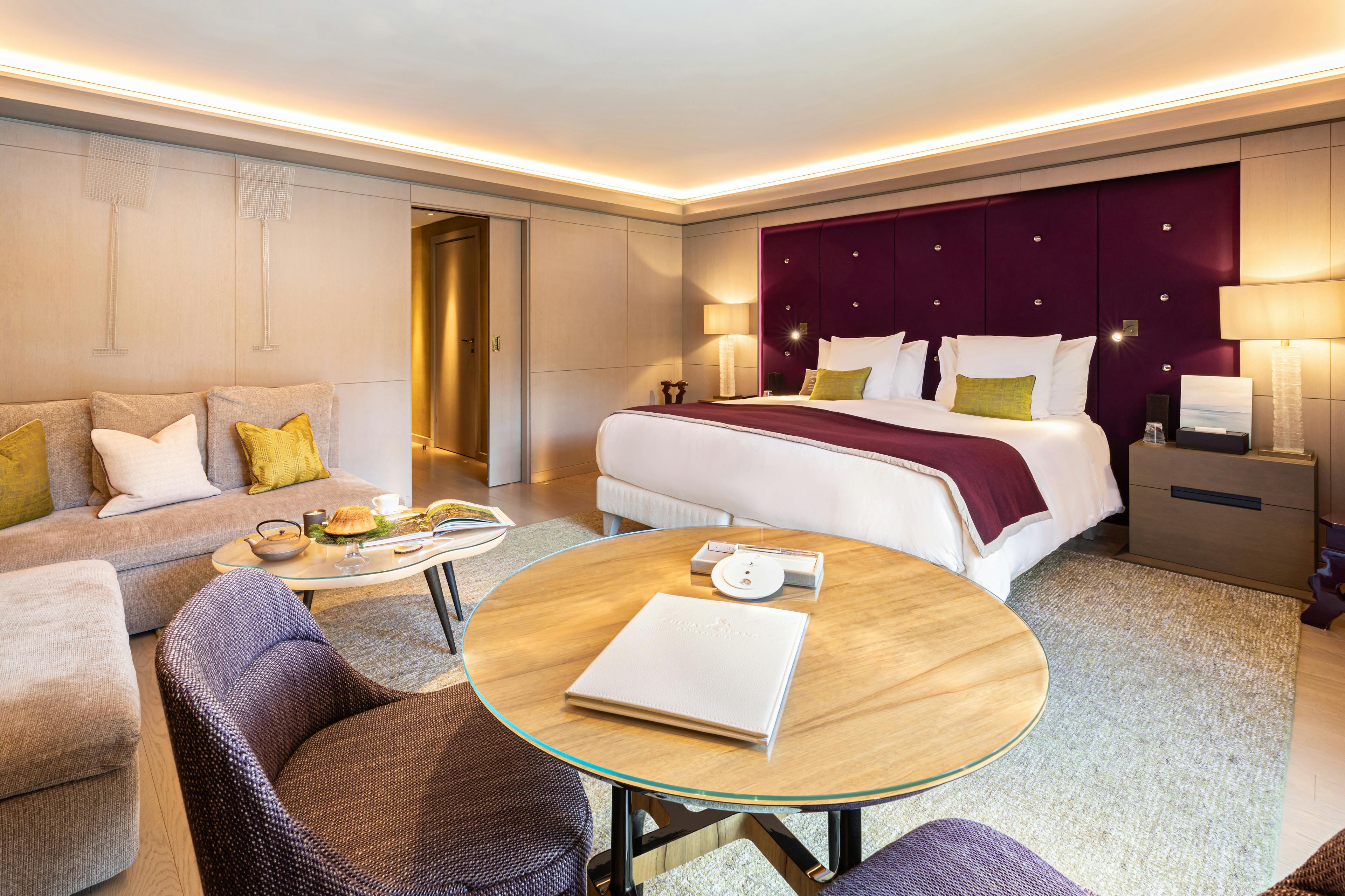 A cosy living area, desk and private balcony or terrace complete the spacious bedroom, separate dressing room, bathroom with a bathtub and hammam-shower with chromotherapy.