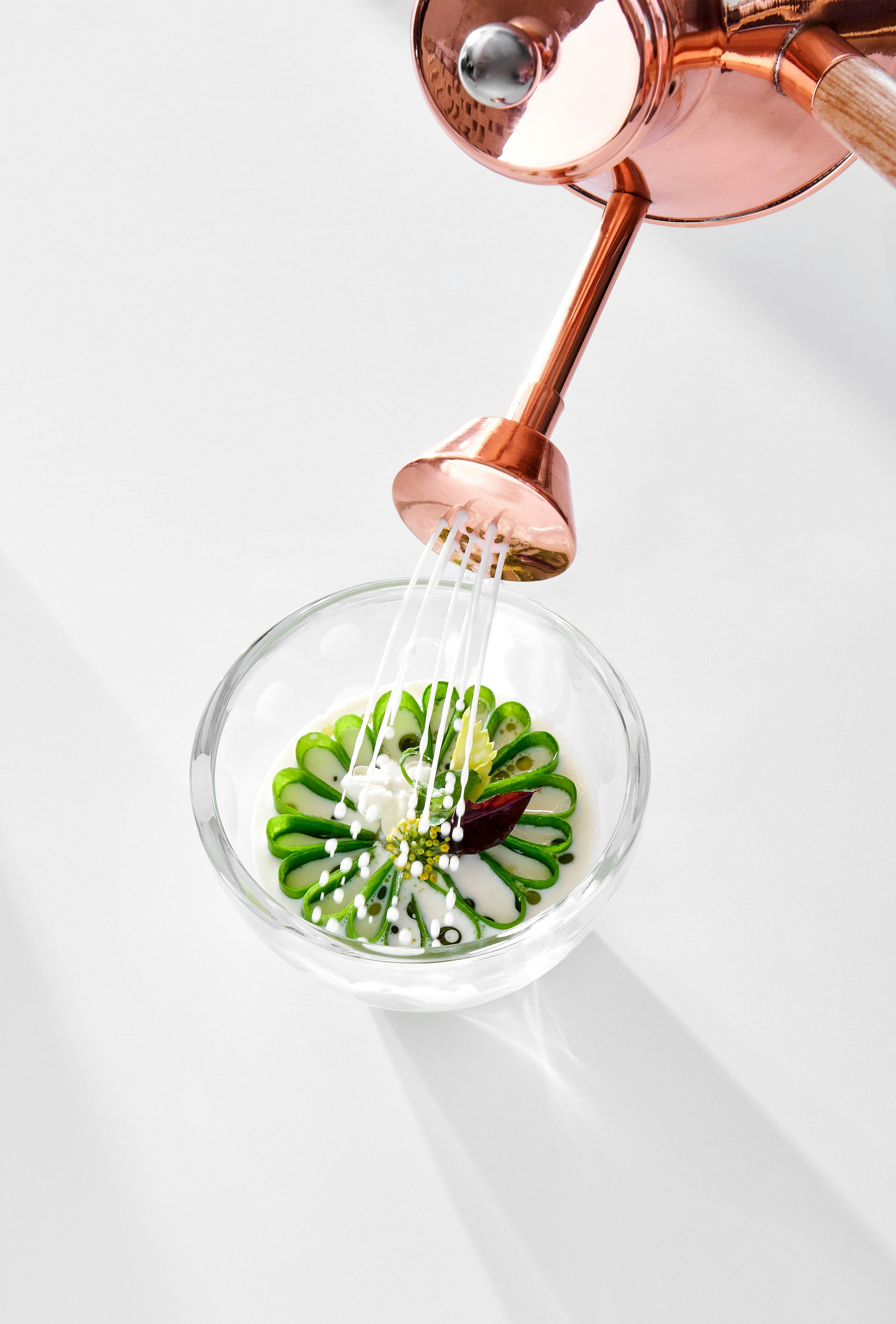 As the curtain comes up, the sauce is centre stage. Arnaud Donckele has donned the apron of a master perfumer. That of a “nose” paying homage to the four seasons as manifested in the sauce, elevated from its standard supporting role to take the lead in this theatre where time has suspended its flight.