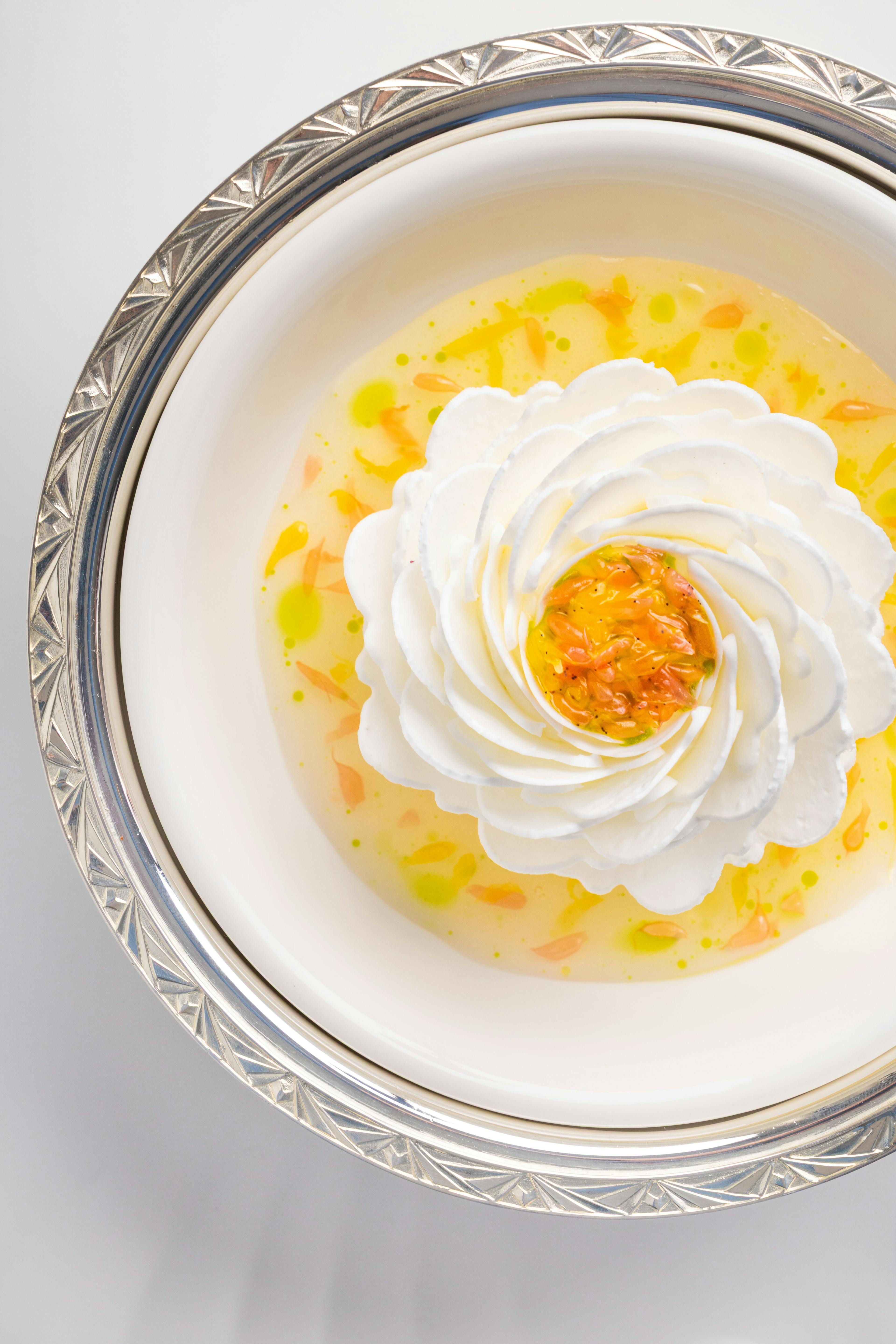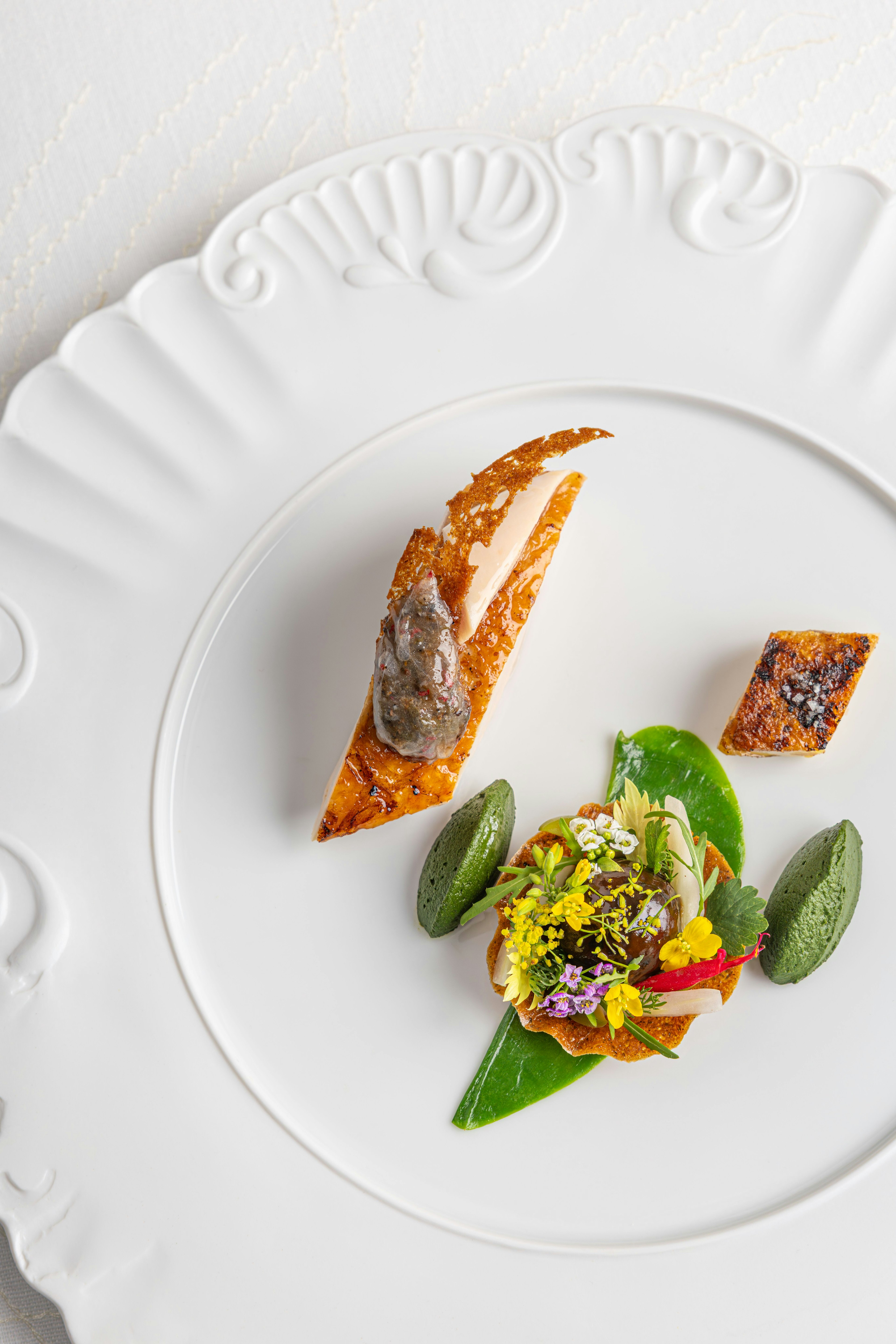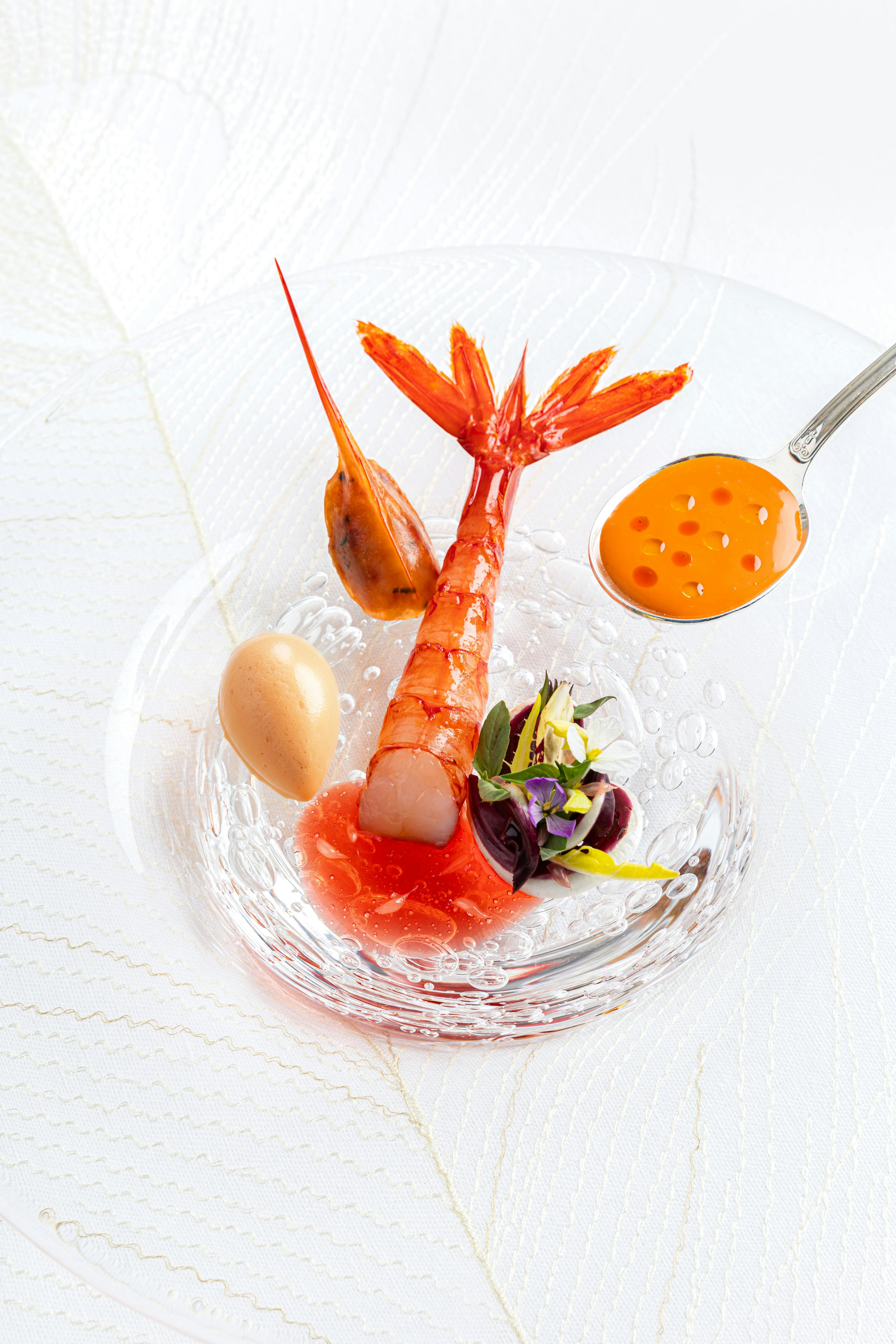 It unites the velvety richness of foie gras lightly infused with Sauternes and saffron, its sweetness lifted by a perfumed quince chutney, with a Plombière brioche in the style of a panettone, a sweet creation infused with apricot, ginger, yuzu, raisin and kumquat.