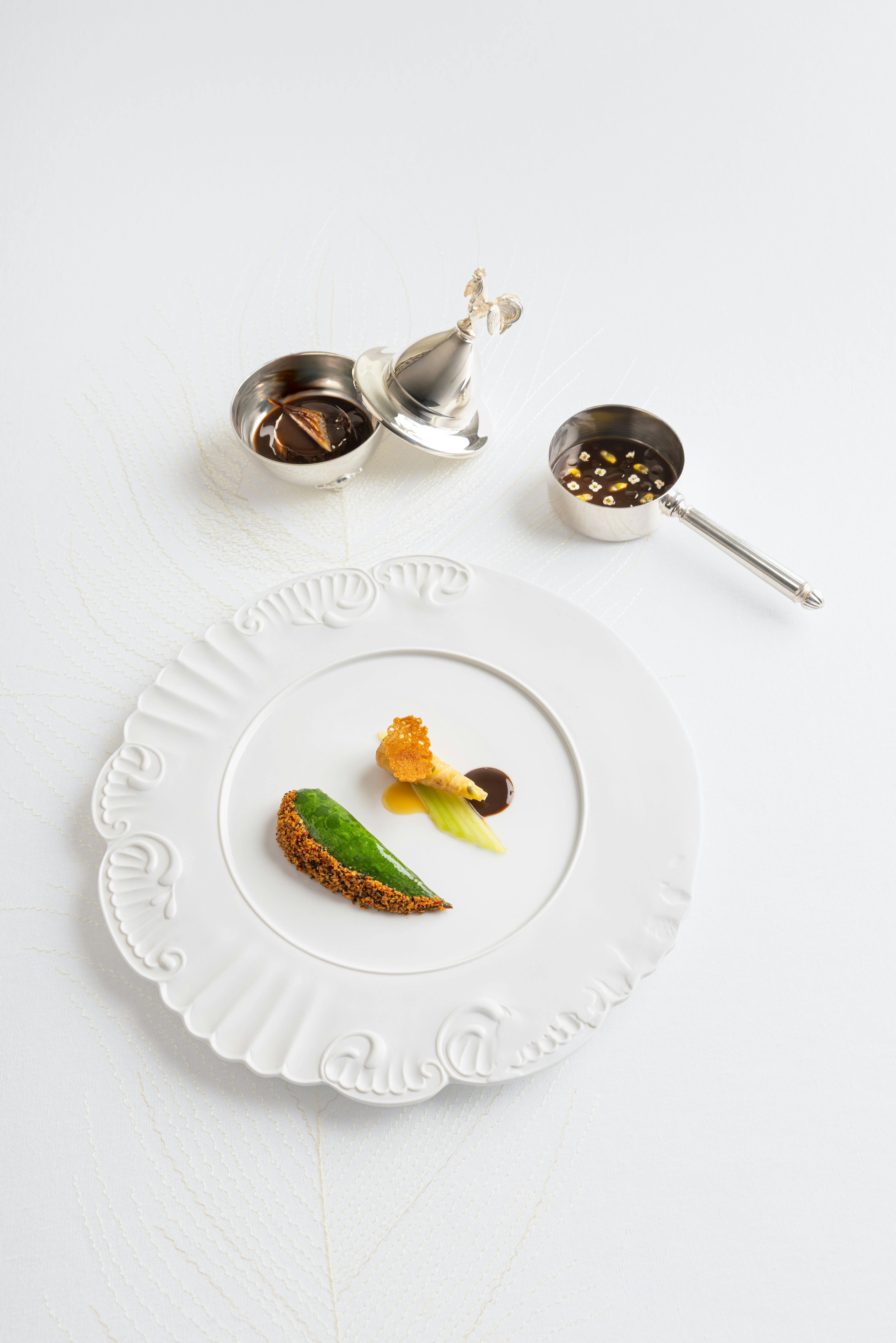 As the curtain comes up, the sauce is centre stage. Arnaud Donckele has donned the apron of a master perfumer. That of a “nose” paying homage to the four seasons as manifested in the sauce, elevated from its standard supporting role to take the lead in this theatre where time has suspended its flight.