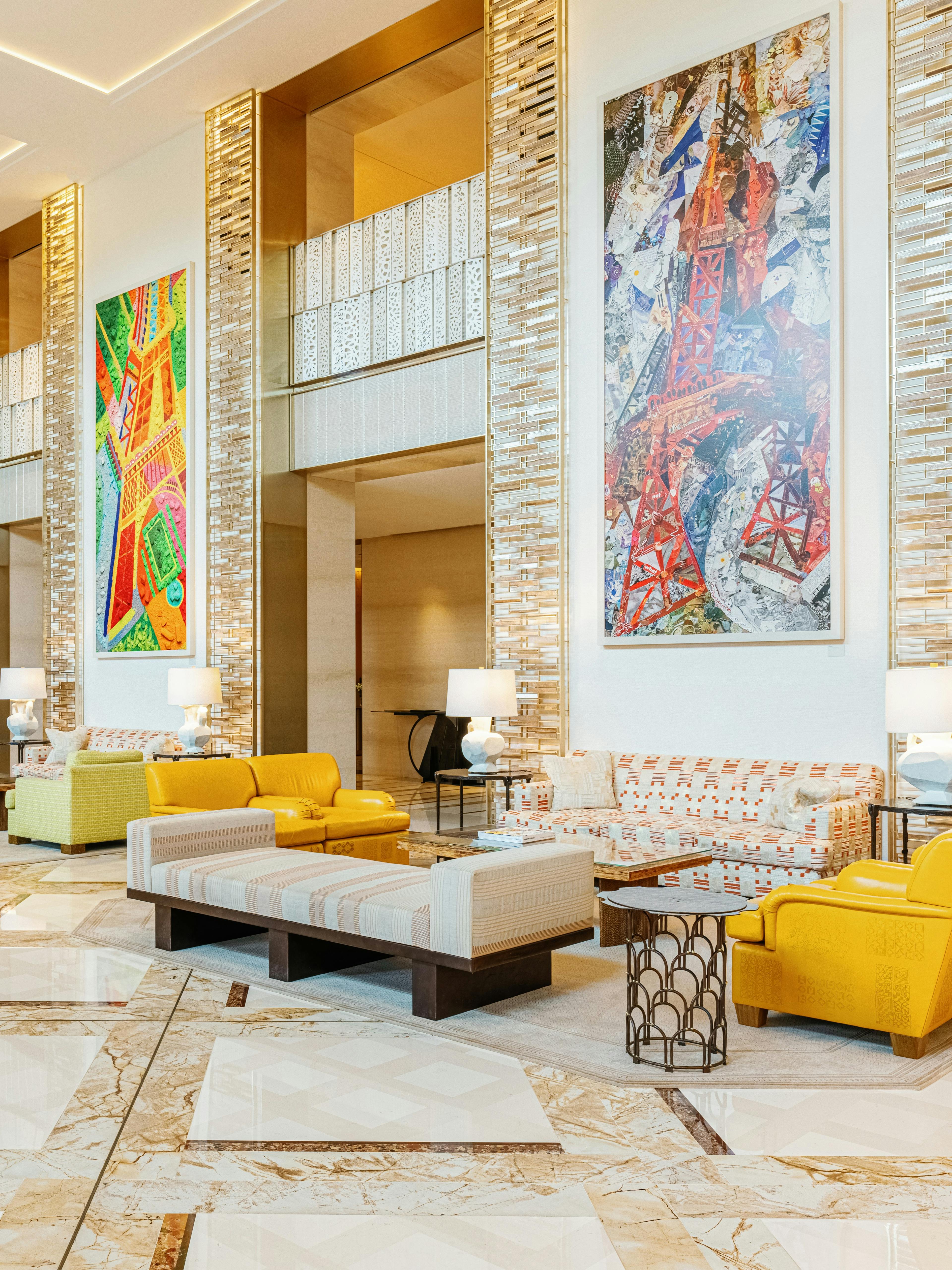 Staged with bold creativity by Peter Marino, the Deluxe Room unveils a spacious haven of tranquillity. With a vibrant palette of textures and colours, it offers a warm, homely atmosphere with a desk area and reading nook facing onto large bay windows.