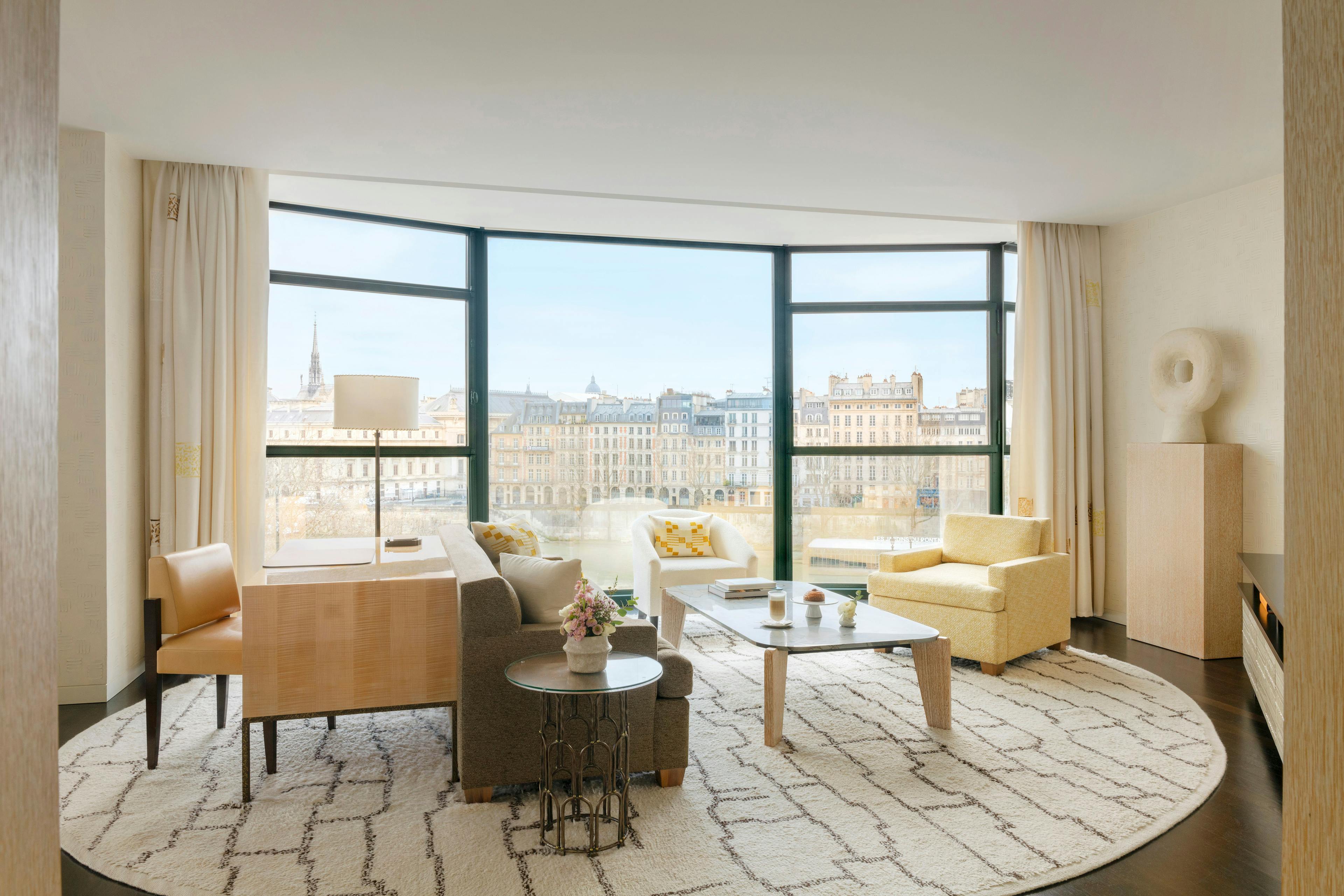 The floor-to-ceiling bay windows reveal inspirational views of Paris. Bathed in light, the Seine Suite unveils generously sized rooms and a decidedly contemporary atmosphere.