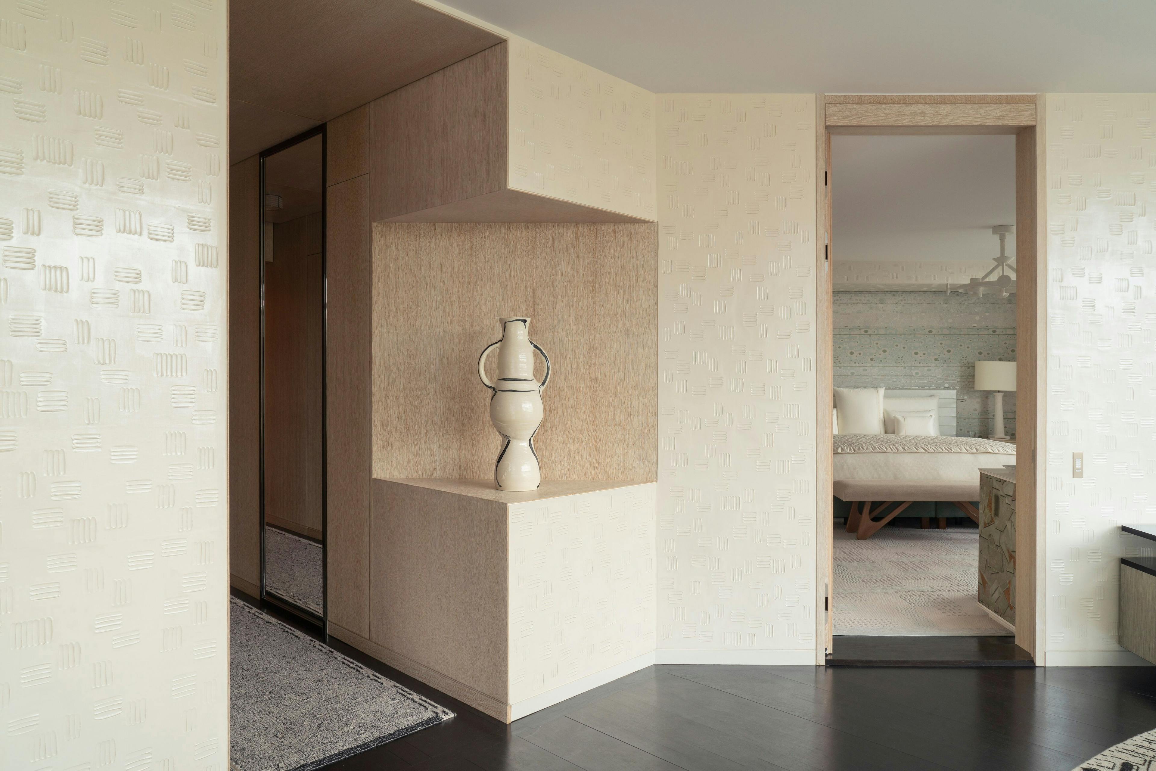 Designed by Peter Marino, the suite reveals a spacious bedroom decorated in warm tones and a living room bathed in Paris’ gentle light. Imagined as a real pied-à-terre, the living room hosts a lounge and dining area with a private bar and wine cellar, perfect for sharing precious moments together.