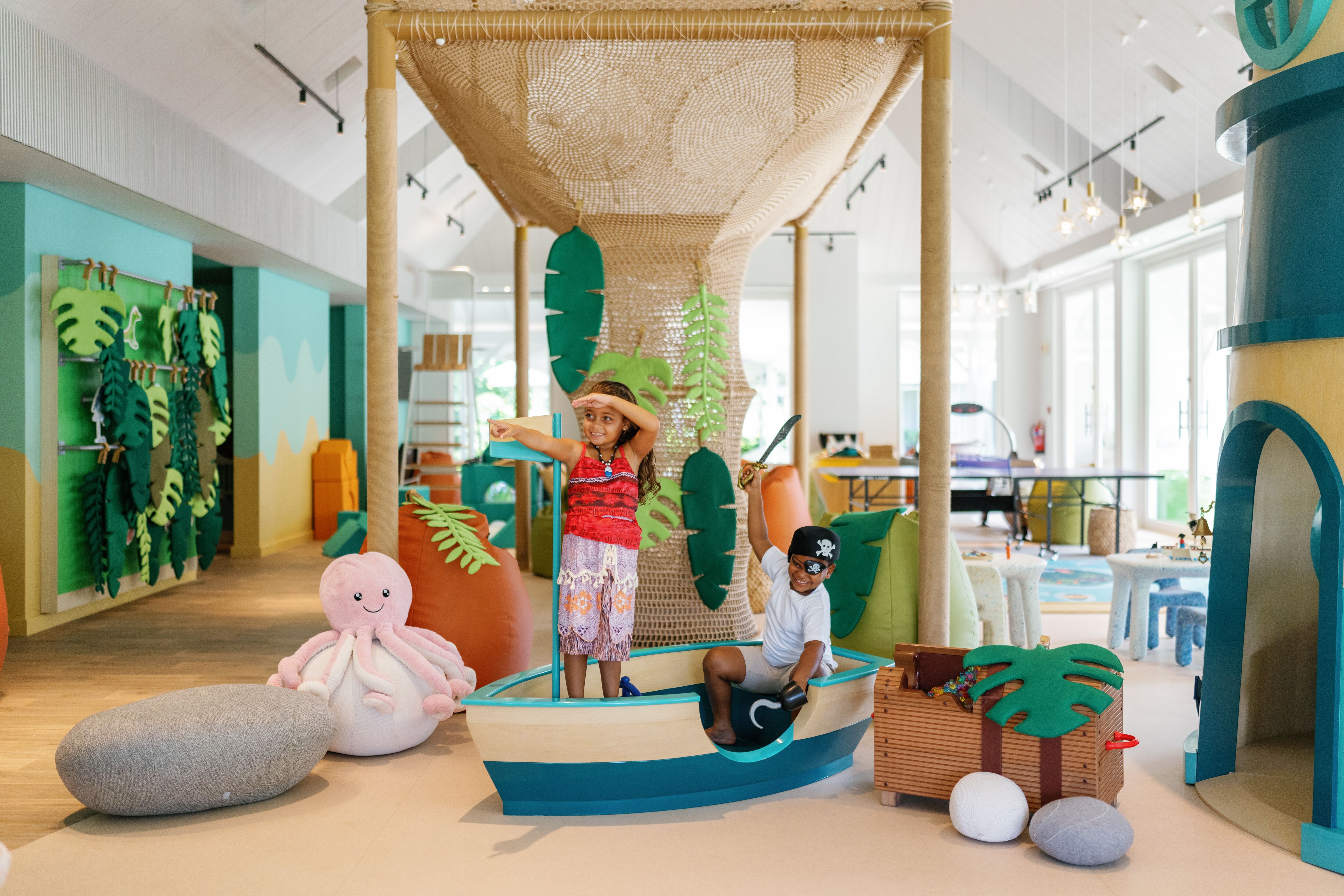 Amidst lush surroundings, young explorers revel in a 1,300 sqm (14,000 sqft) outdoor haven. Two sparkling pools with towering slides and a whimsical water play area set the stage for laughter, play, and shared discoveries under the tropical sun.