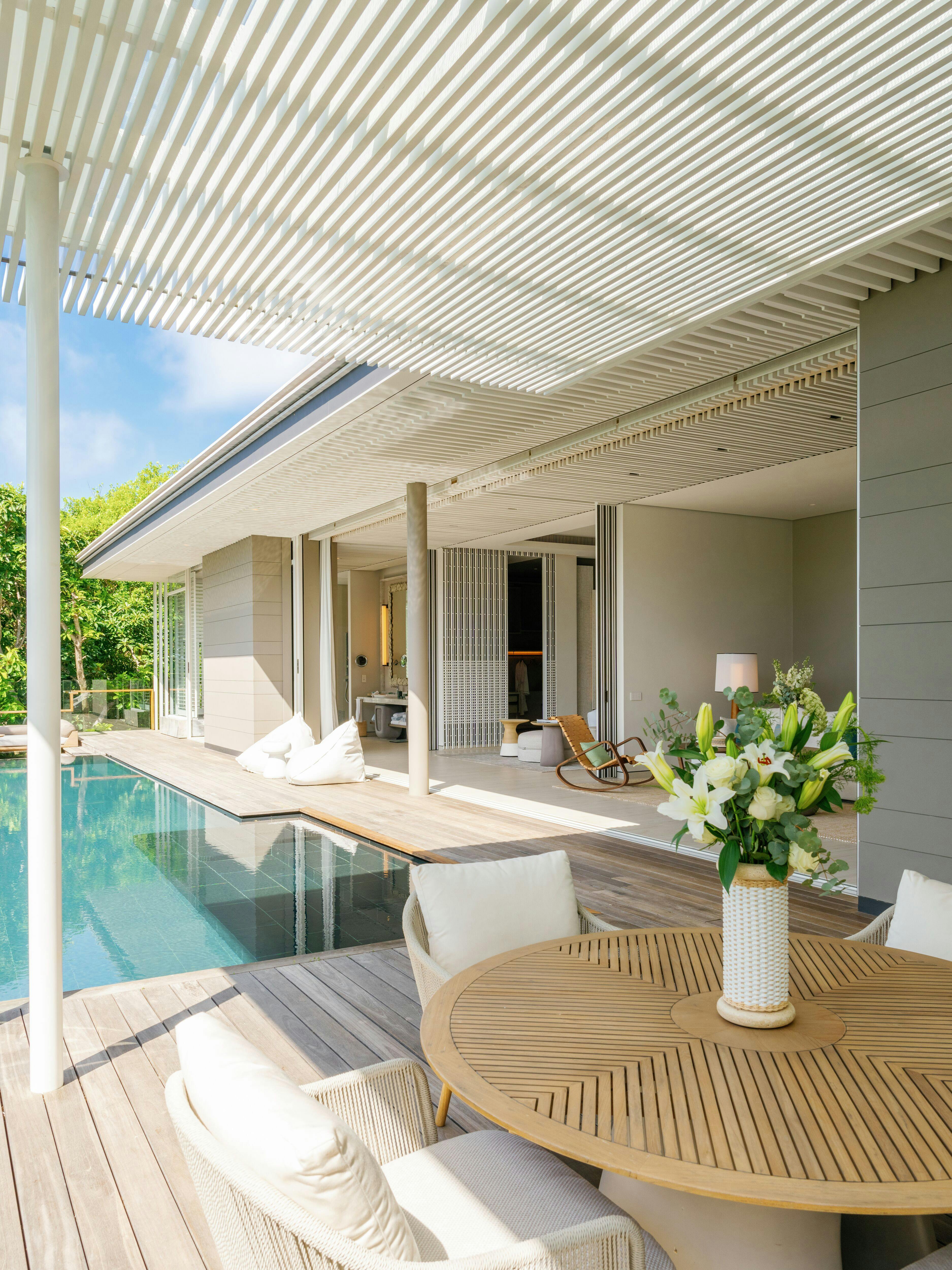 Each villa boasts a meticulously-crafted living space that gracefully extends to an expansive terrace with a private 13-metre-long swimming pool and an outdoor dining pavilion.