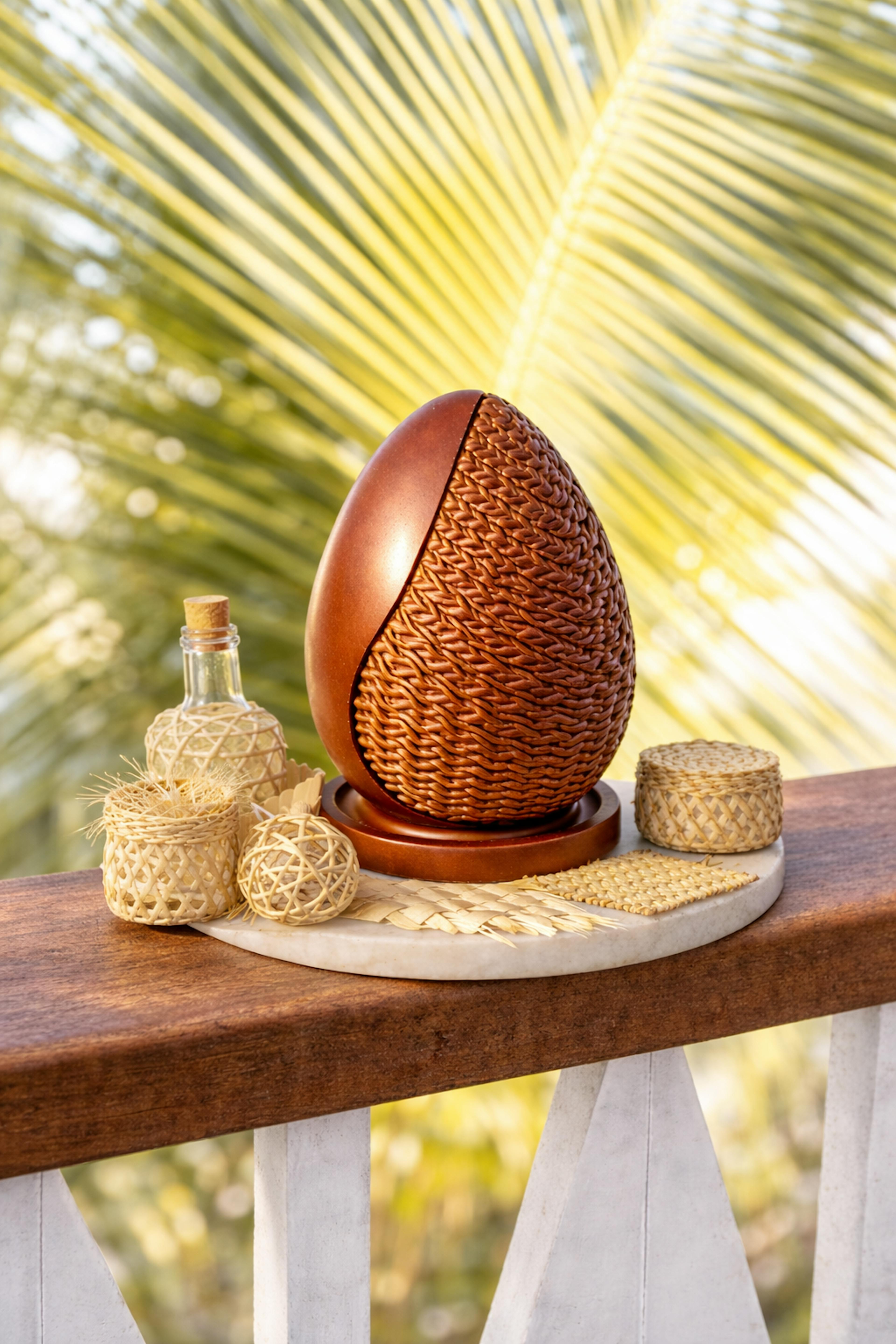 The chocolate egg, a true gourmet work of art, pays tribute to local craftsmanship through an oblique weave of chocolate strands, evoking the precise and patient gesture of traditional braiding. Its delicately plaited shell contrasts with a smooth, satin-like surface, blending artisanal heritage with modern elegance.