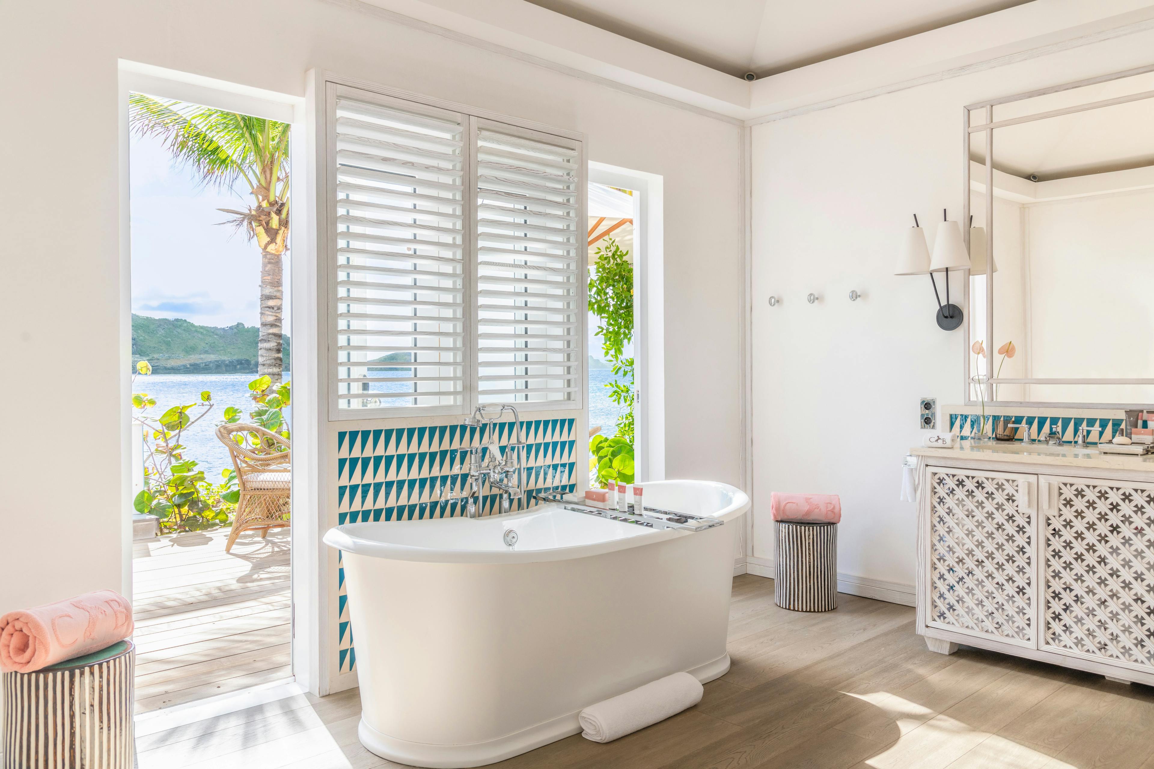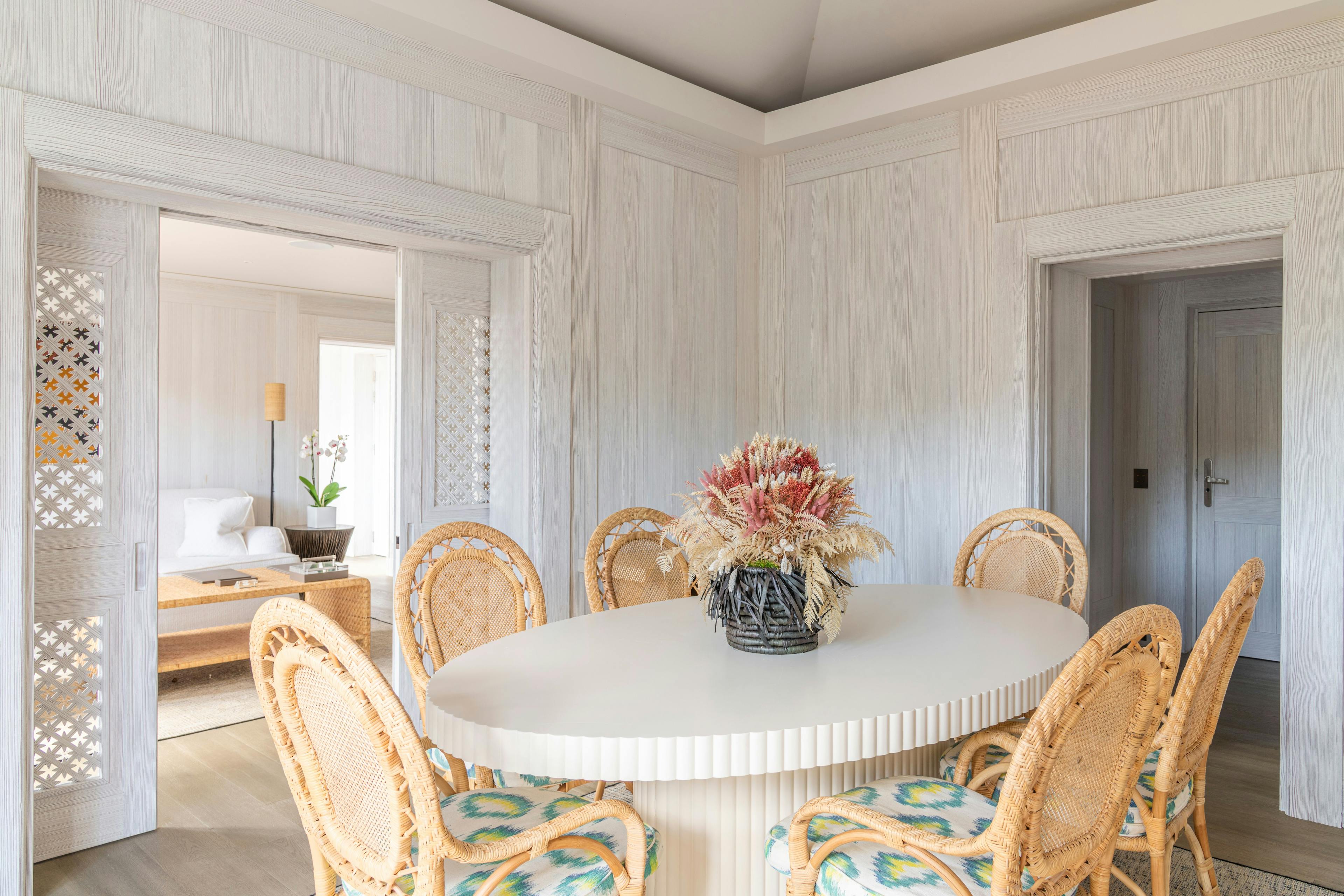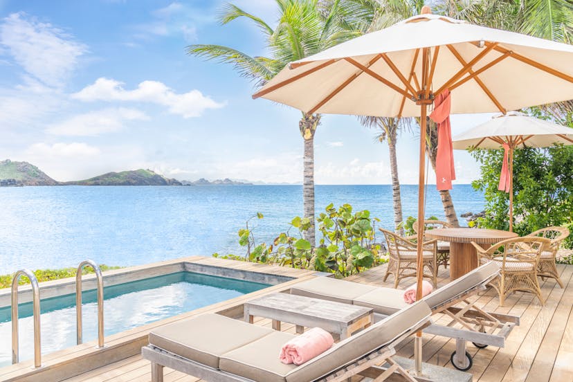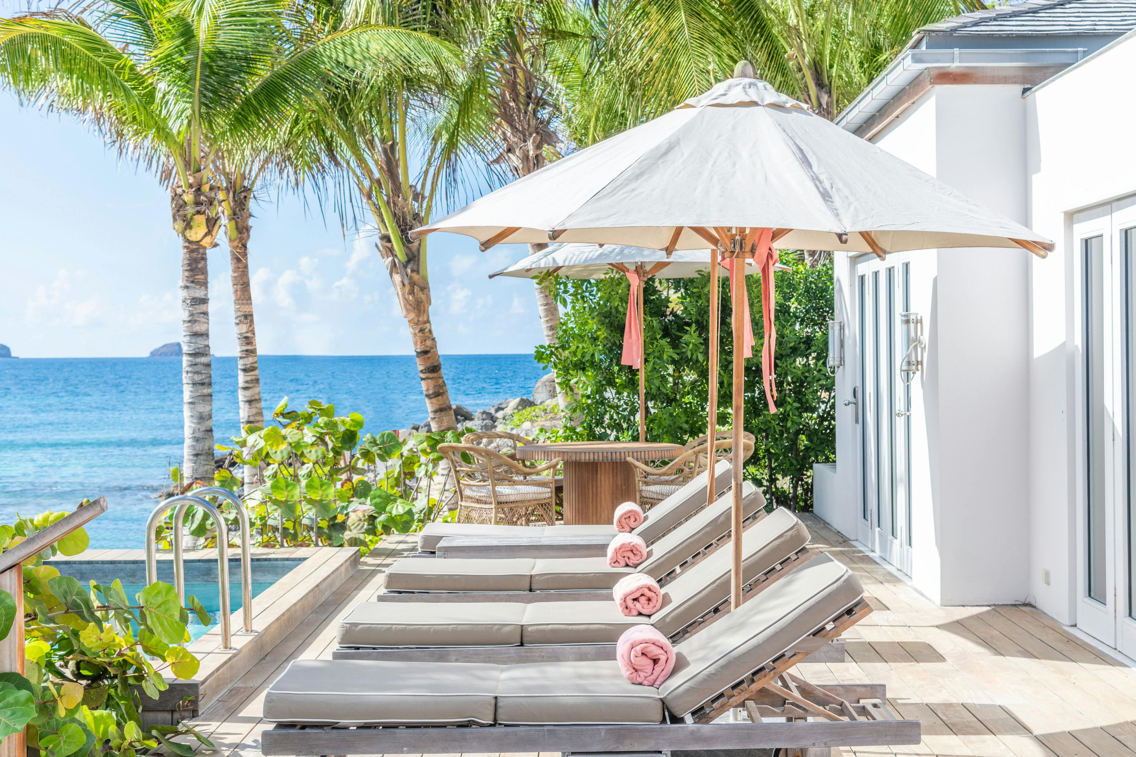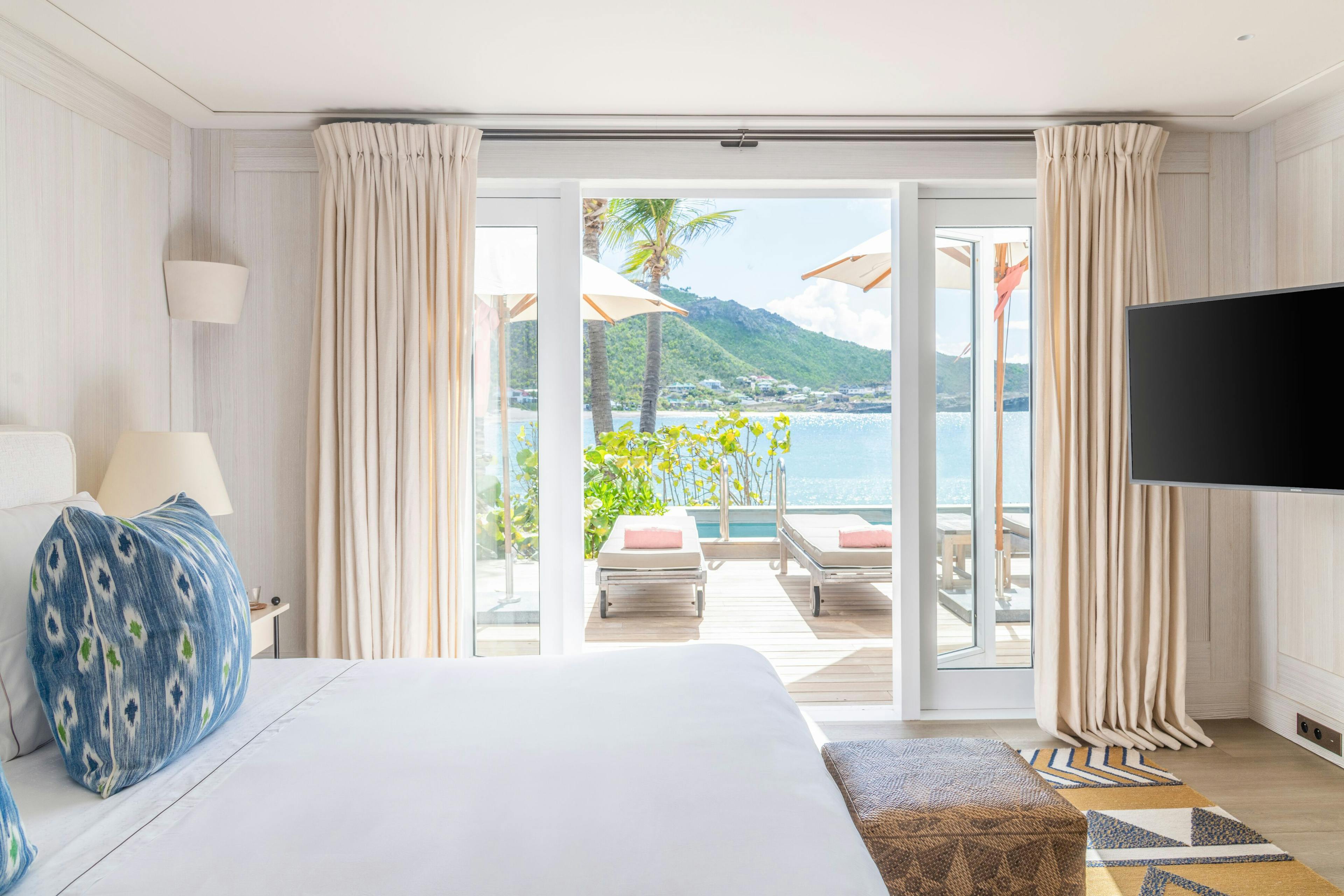 The 2-Bedroom Beach Suite boasts a spacious living room and dining room, private terraces, multiple indoor and outdoor lounge areas, and a private pool overlooking the bay. The two bedrooms, including one with stunning view on Flamands Beach, host ensuite bathrooms with a bathtub and rain shower and large separate dressing rooms.