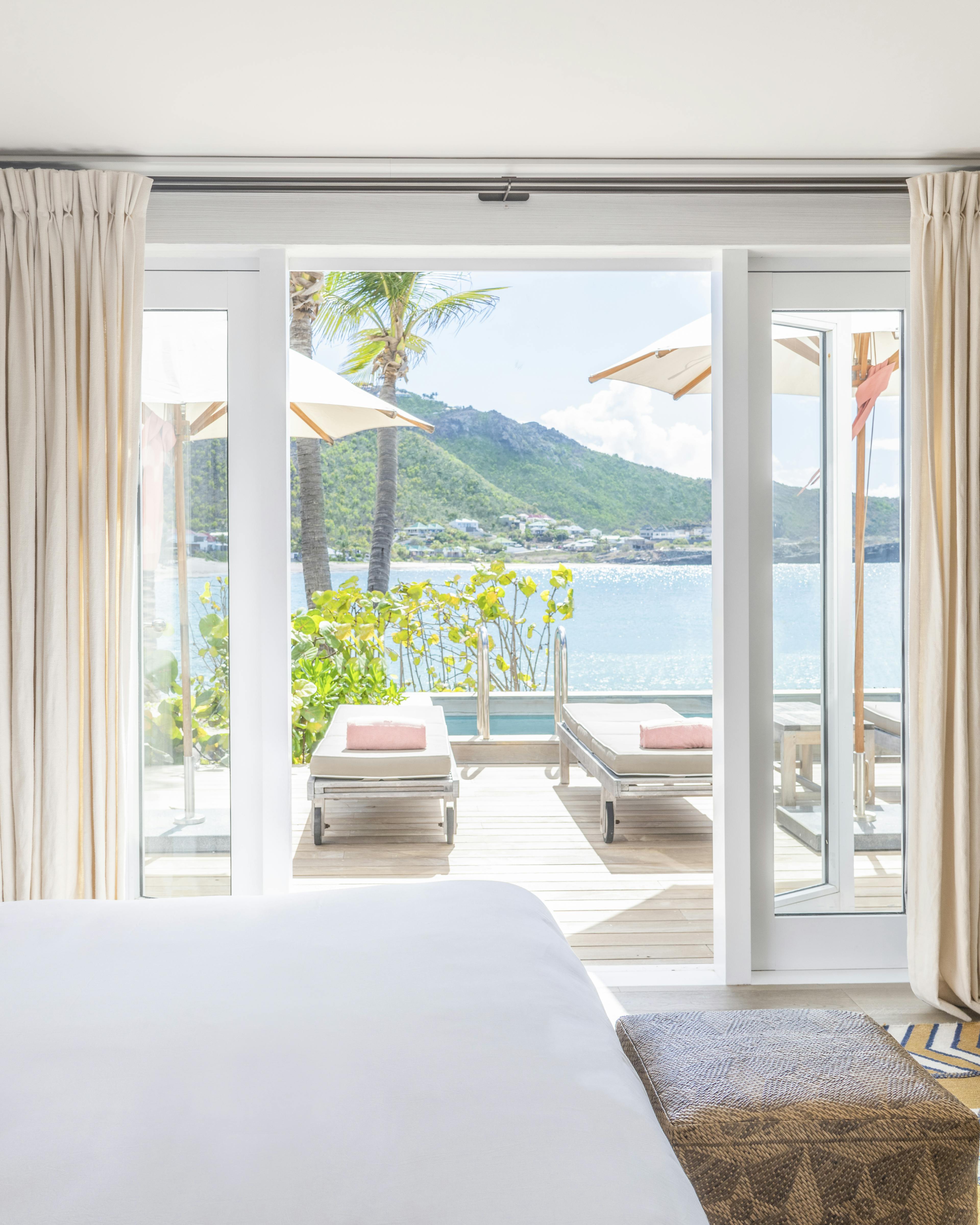 The 2-Bedroom Beach Suite boasts a spacious living room and dining room, private terraces, multiple indoor and outdoor lounge areas, and a private pool overlooking the bay. The two bedrooms, including one with stunning view on Flamands Beach, host ensuite bathrooms with a bathtub and rain shower and large separate dressing rooms.