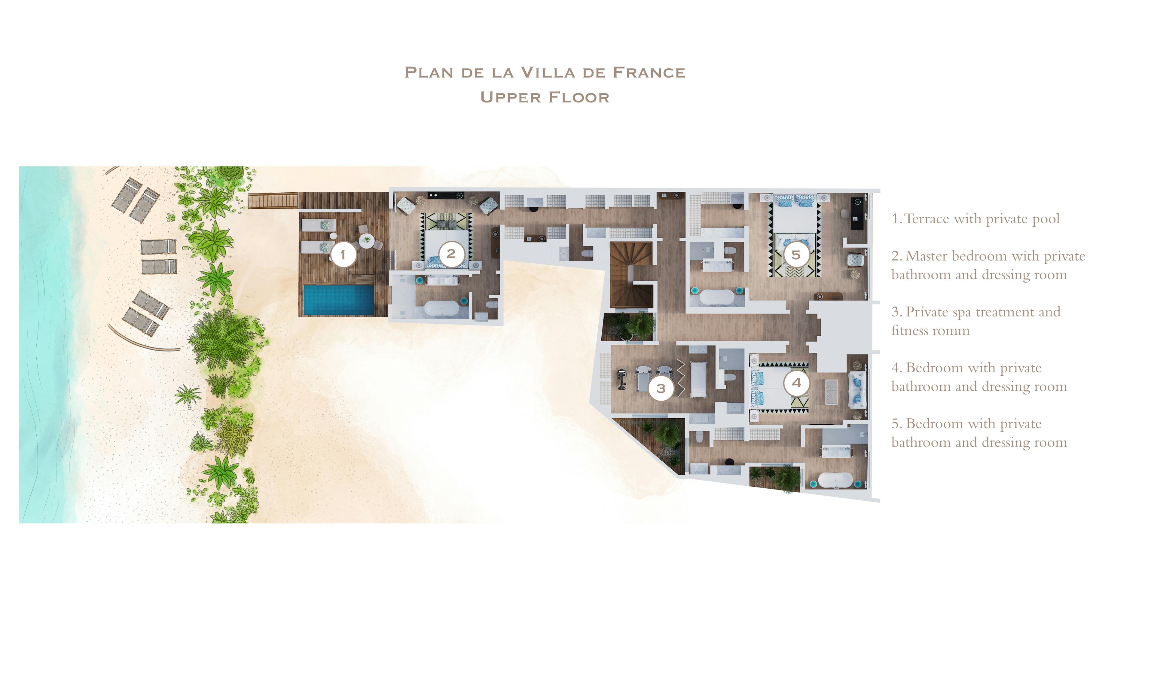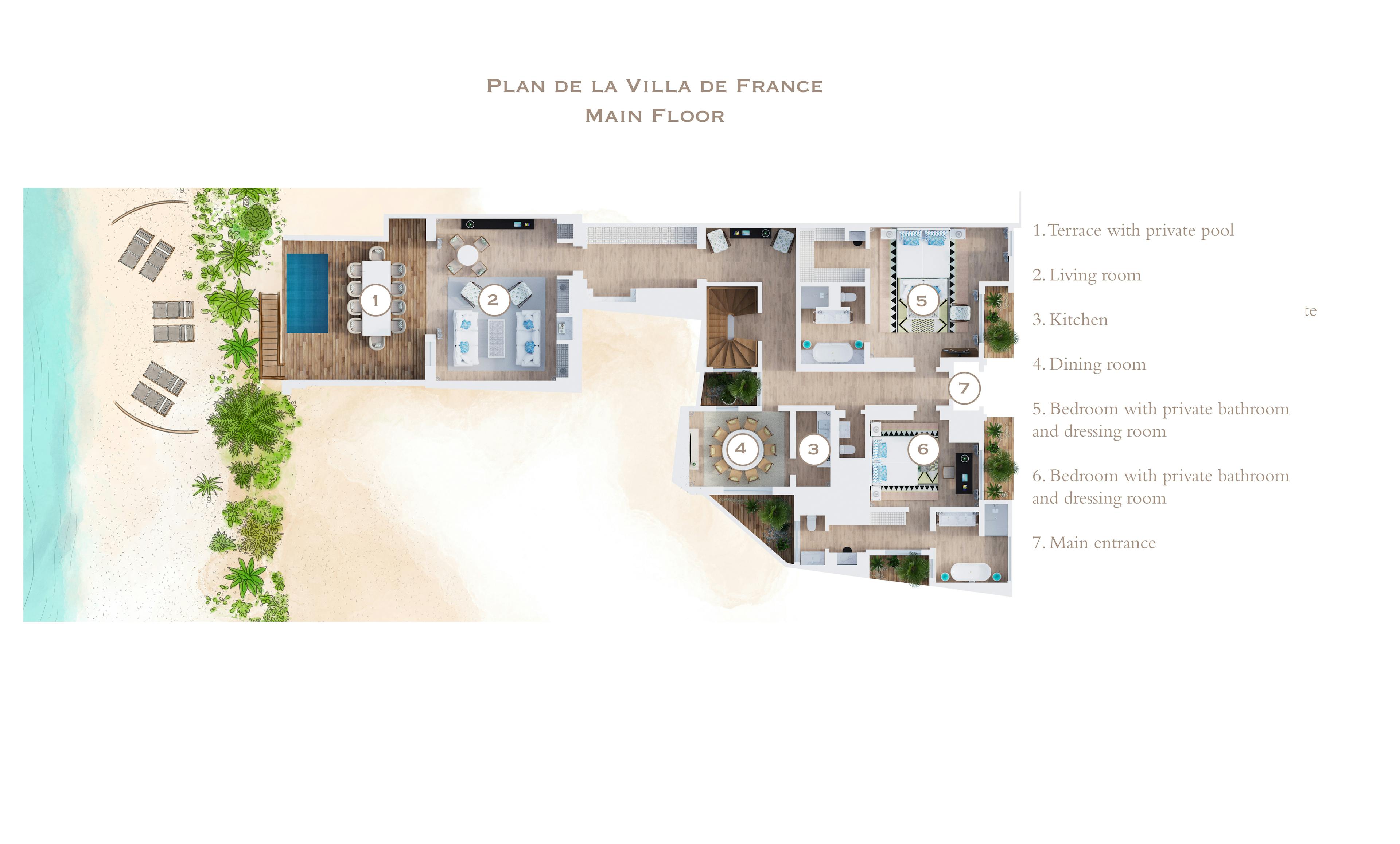 The 650 m2 villa boasts exceptional private spaces, including two infinity pools and a treatment and fitness room. The large living room on the first floor opens onto a private terrace offering breathtaking views of the Caribbean Sea. The private, convivial dining room can accommodate up to ten guests.