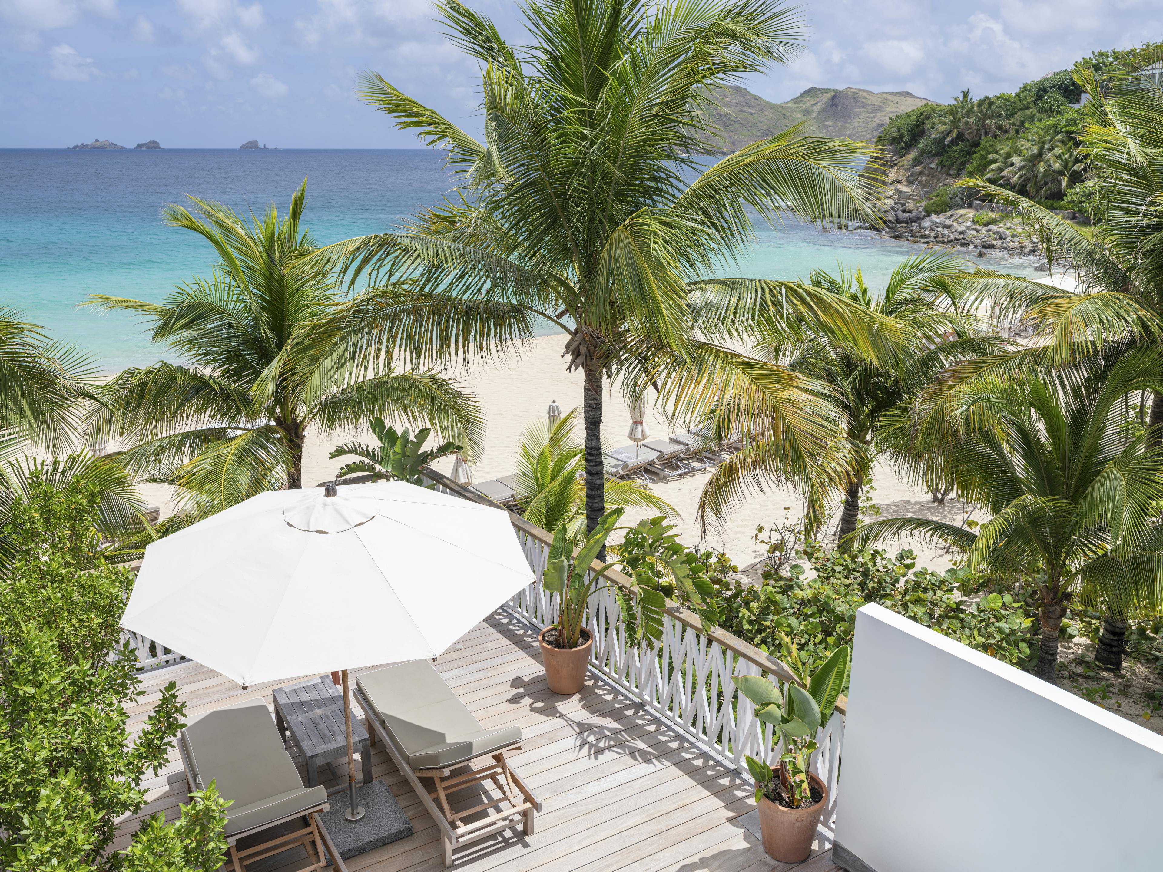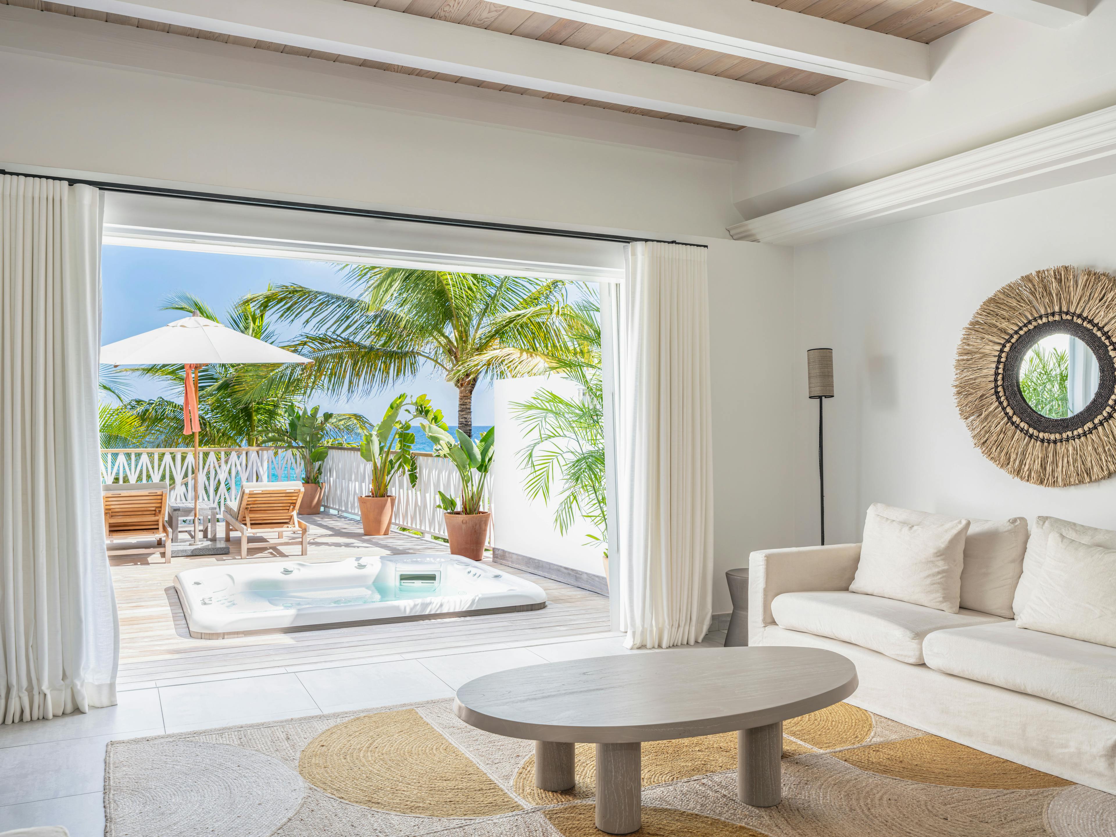 Bathed in tropical light, the 2-Bedroom Beach House also includes a living room and dining area with a kitchenette opening onto a terrace with direct beach access via few steps and a private hot tub.