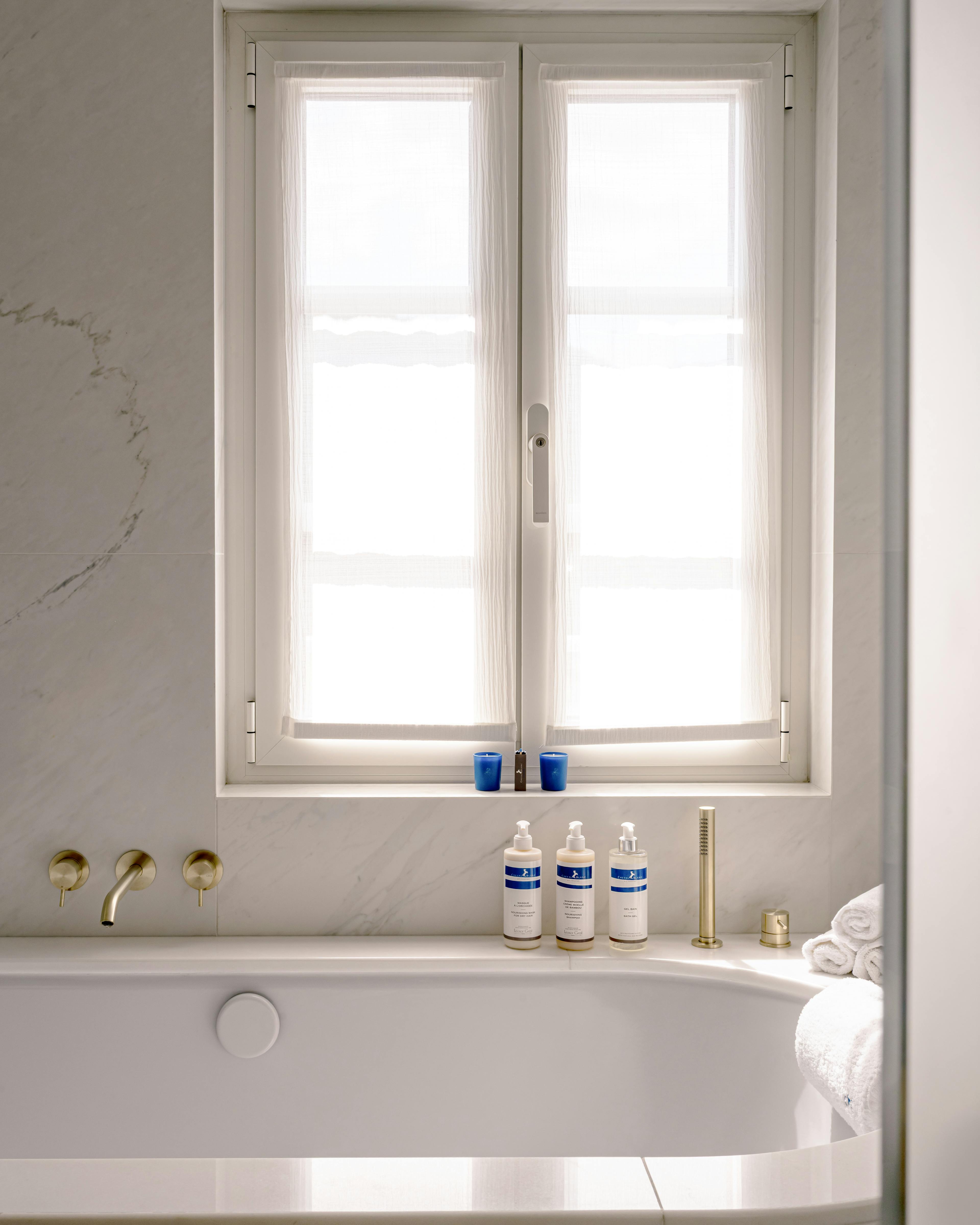 The room extends over 30 sqm (330 sqft) and offers plush chairs as well as a bathroom with a bathtub and separate shower.