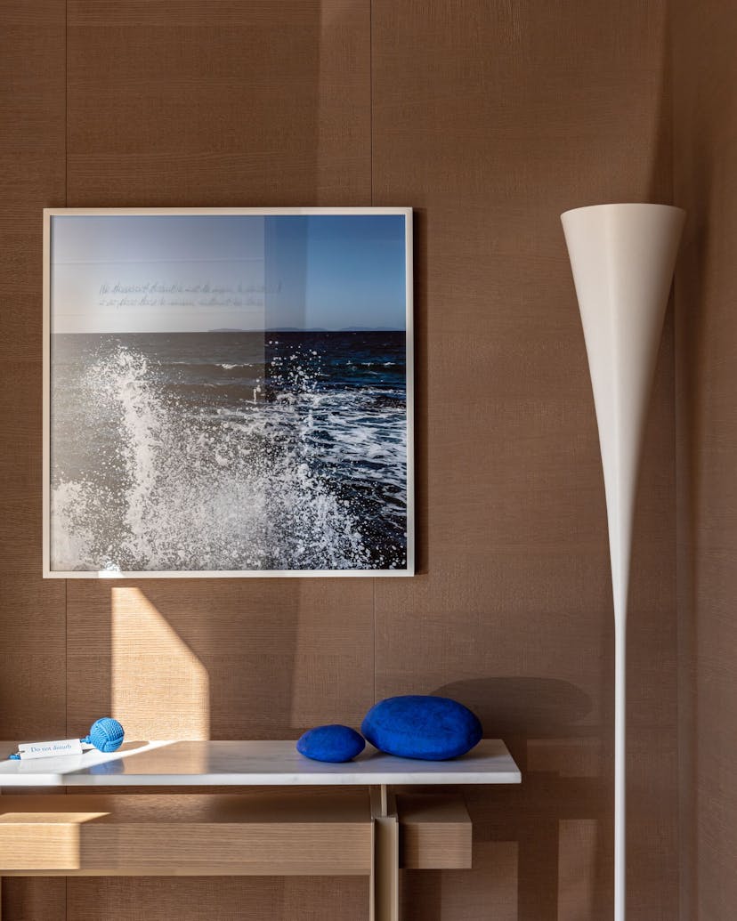 Lost in a mural of Riviera blue views, found in a sea of fluffy white pillows. Let that lazy feel take over in grand spaces.