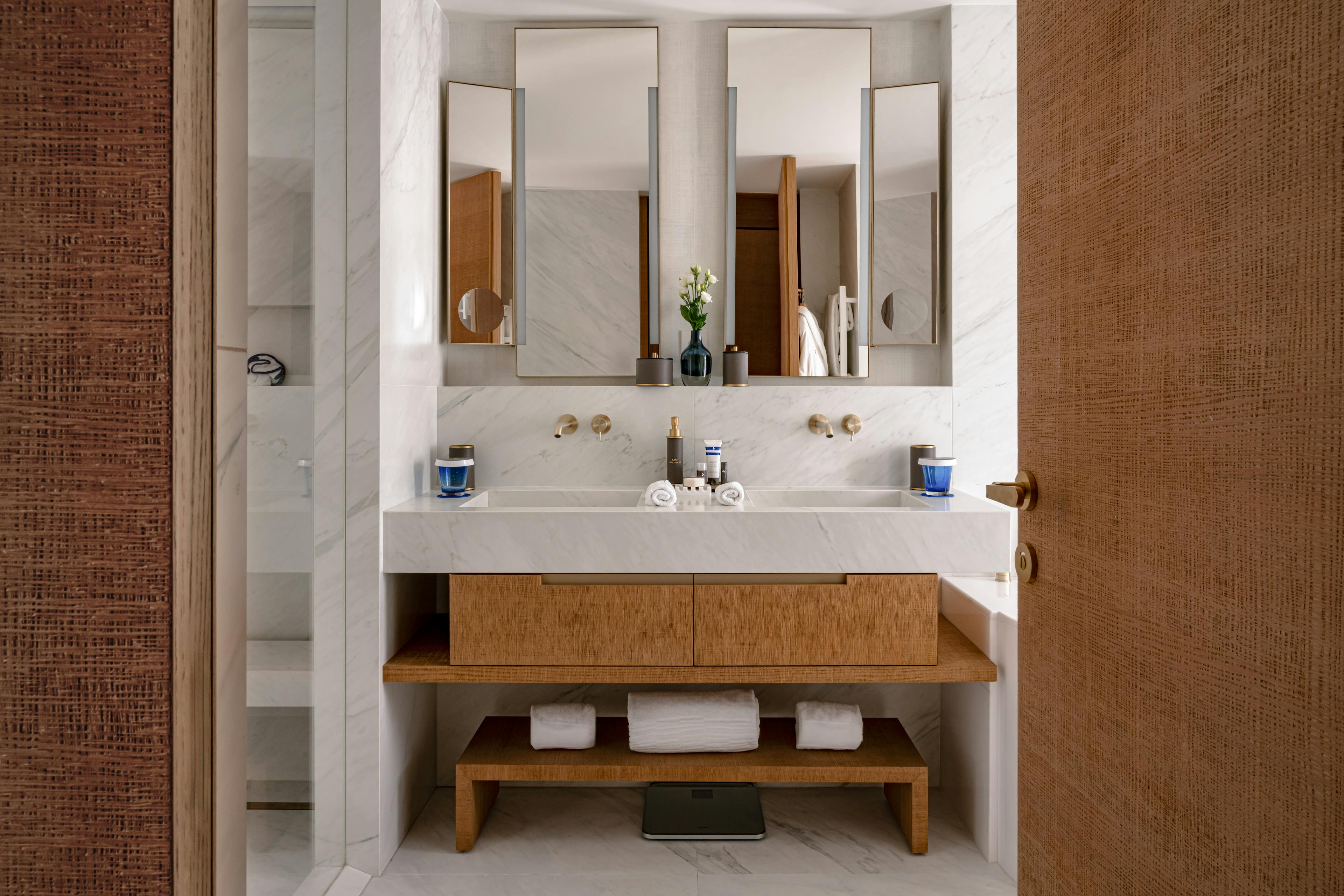 The room extends over 30 sqm (330 sqft) and offers plush chairs as well as a bathroom with a bathtub and separate shower.