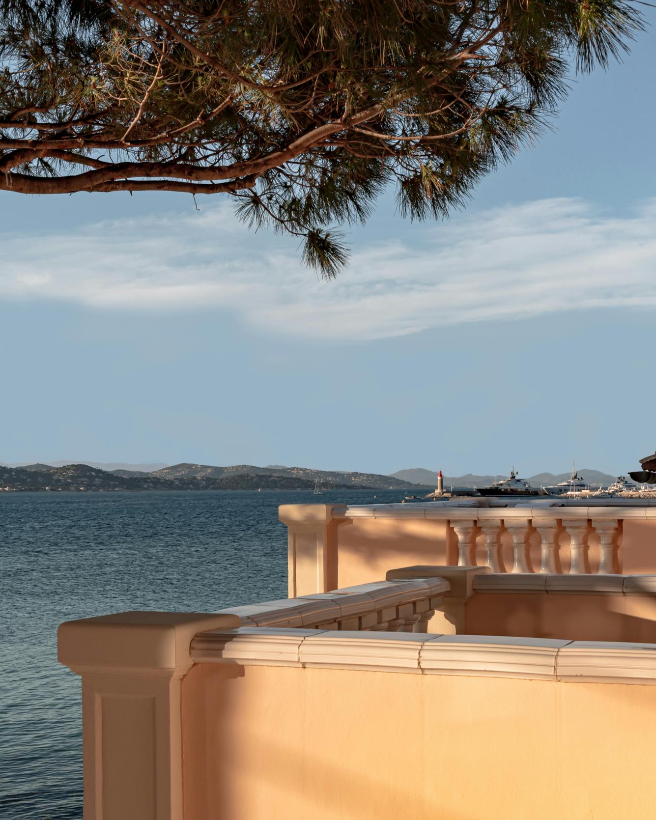 A terrace unveils sparkling views over the Bay of Saint-Tropez.