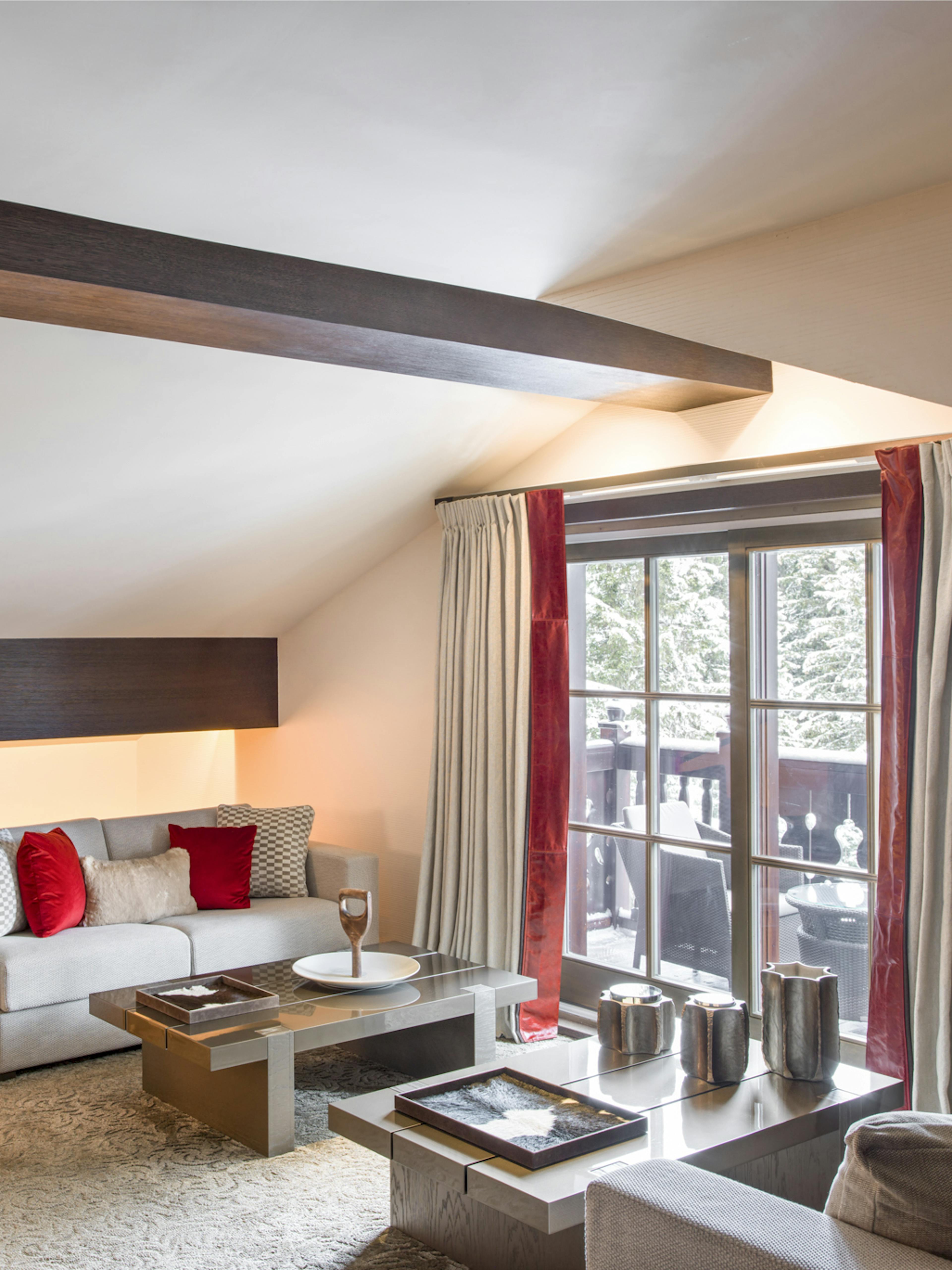 Le balcon enneigé encercle délicatement l'étage, proposant ainsi de nombreux espaces de relaxation au grand air après une journée sur les pistes.
