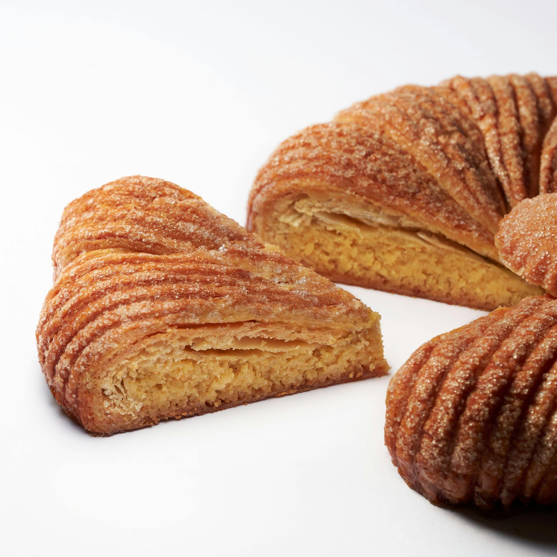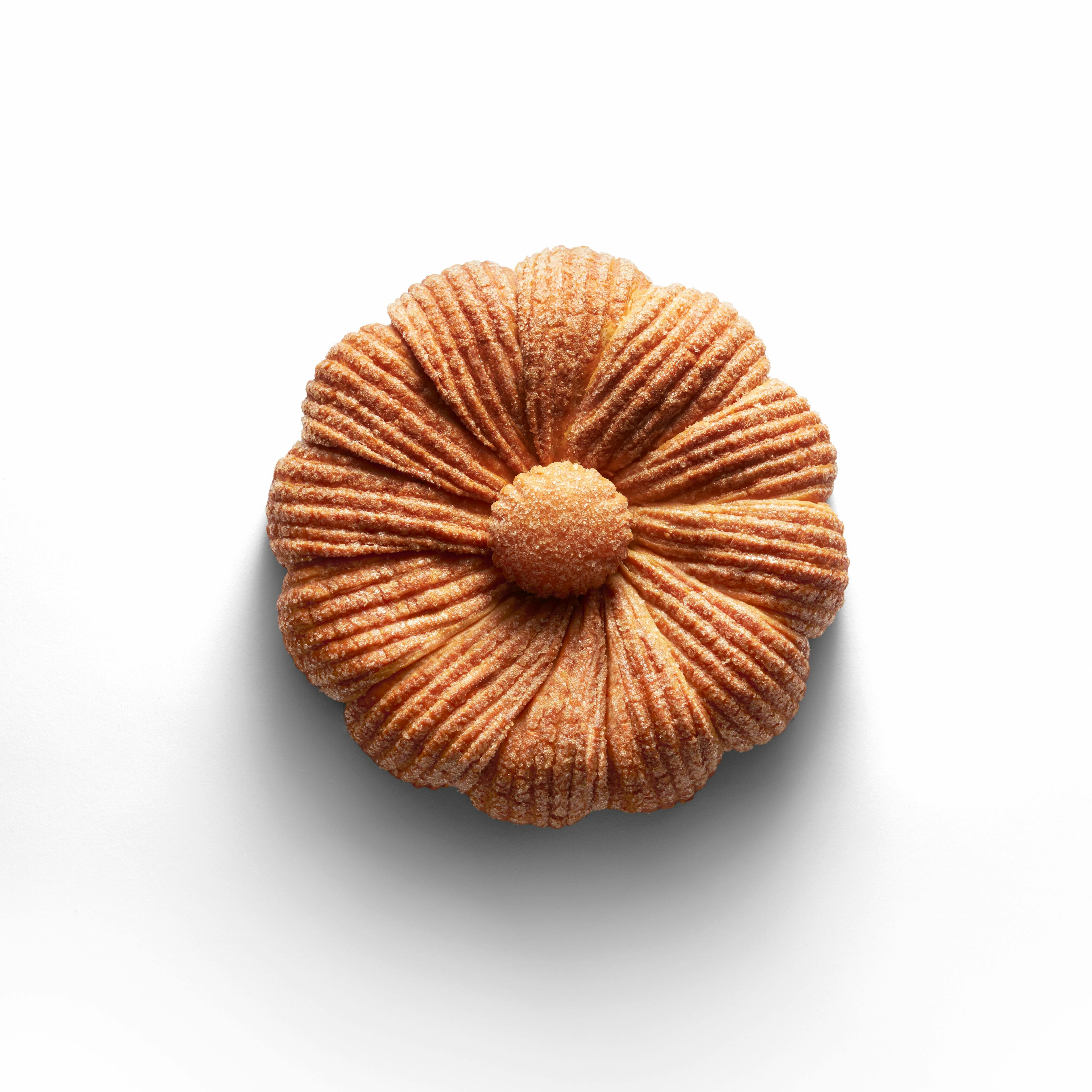 Son feuilletage aérien, nourri de beurre normand et de farine d’Auvergne, se pare d’un voile de sucre caramélisé qui lui donne une teinte dorée et chaude. Chaque pétale, façonné à la main, est ajusté avec minutie par les boulangers pour former une corolle régulière, dont le cœur généreux capte la lumière. Les fines stries qui parcourent la pâte rappellent les lignes gracieuses de la fleur, comme esquissées par un botaniste attentif.