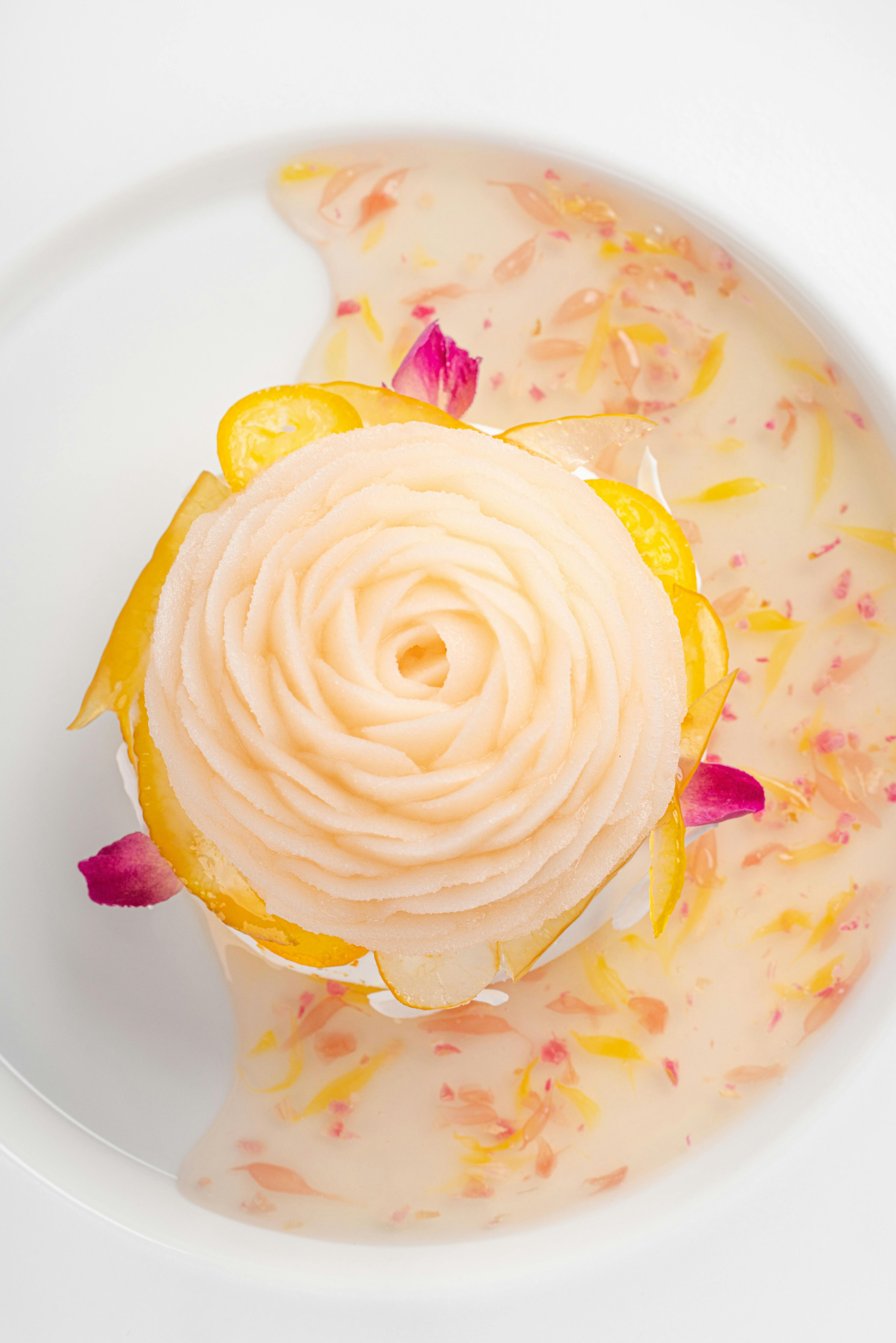 Il mêle la douceur d'un foie gras mi-cuit au Sauternes et au safran, accompagné d’un chutney de coing parfumé, ainsi qu’une brioche Plombière façon panettone aux notes d’abricot, de gingembre, de yuzu, de raisin et de kumquat.
