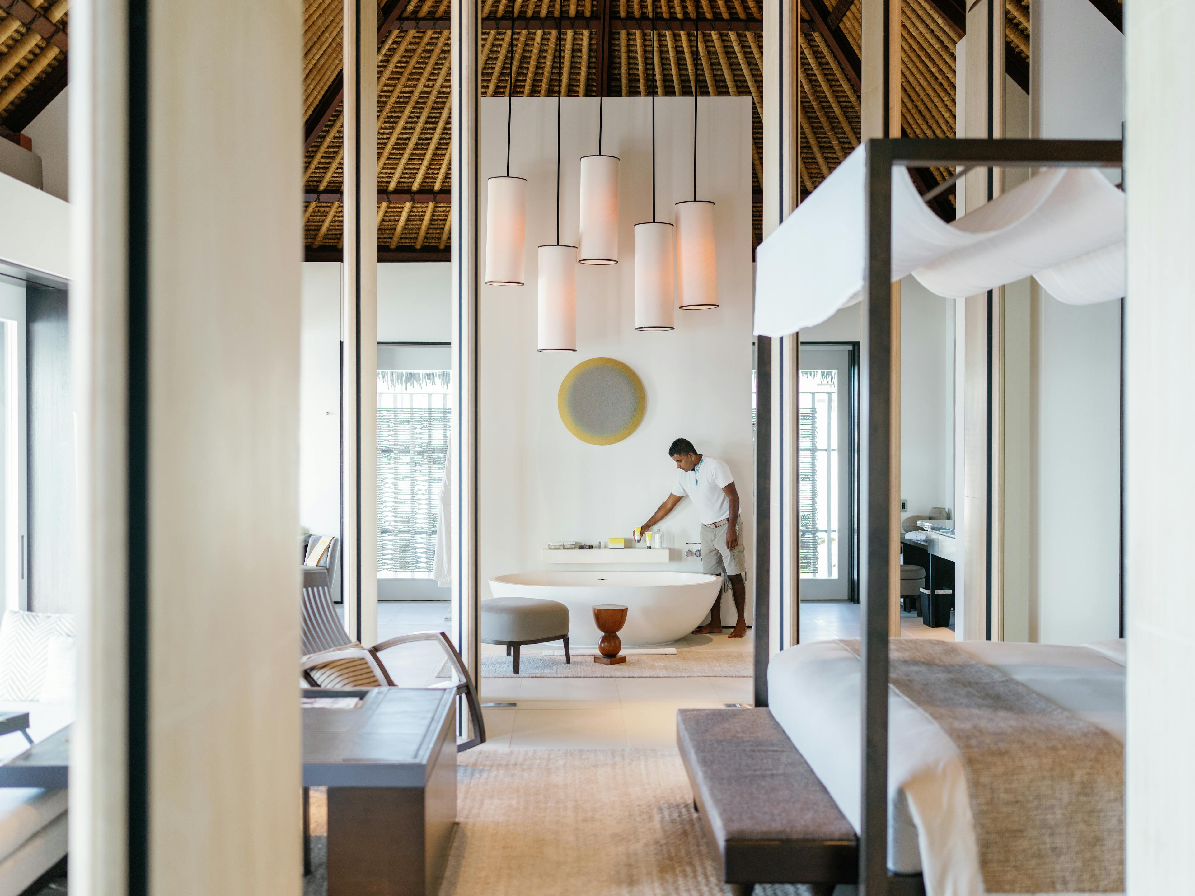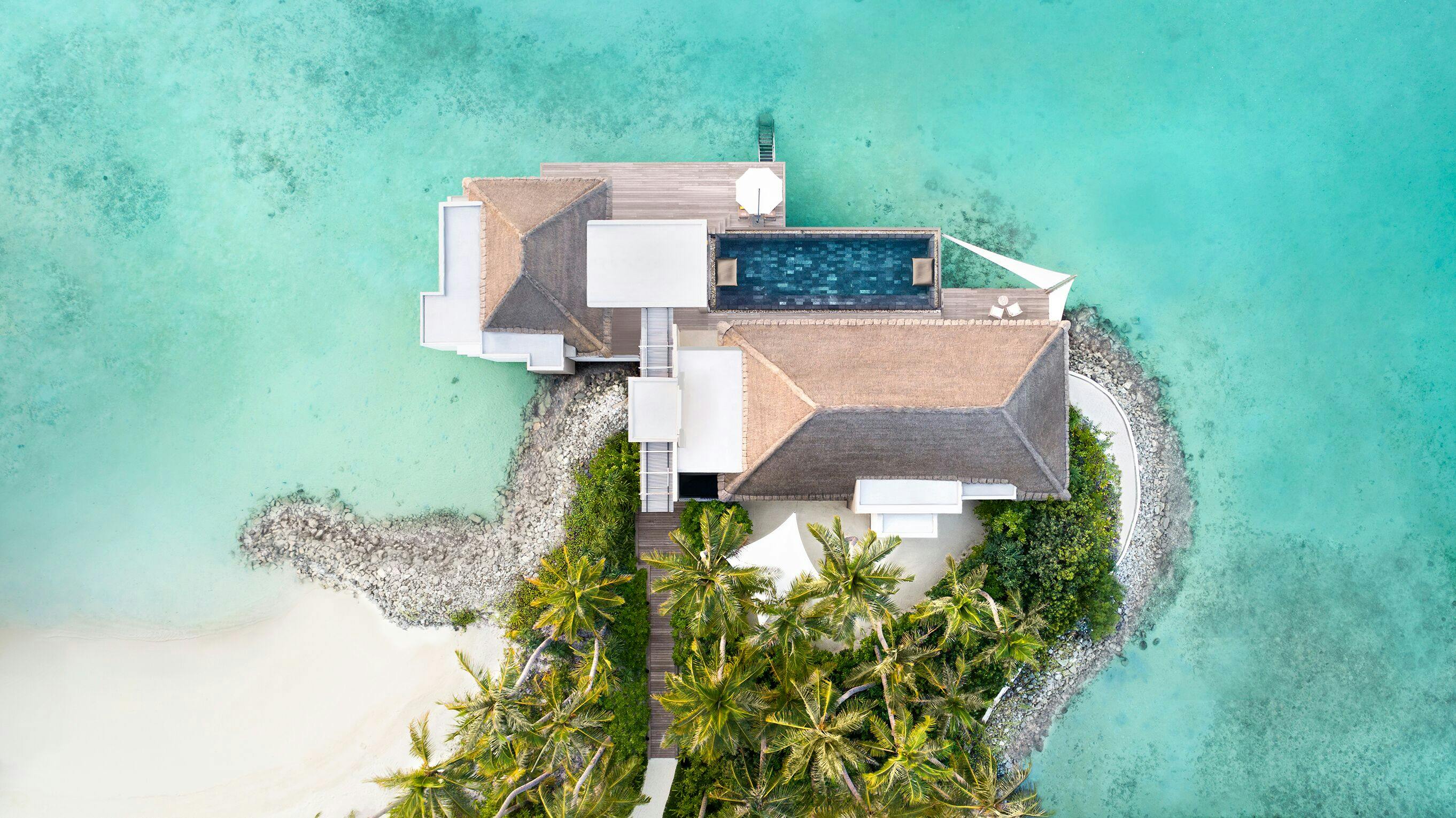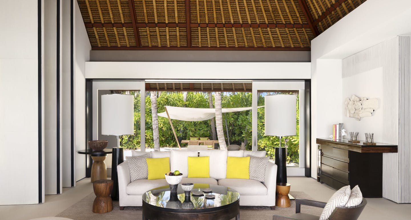 Une partie perchée sur pilotis et l’autre ouvrant sur un jardin exotique, la Garden Water Villa a un parfum d’inédit aux Maldives. A l’intérieur se succèdent un salon spectaculaire, une chambre à coucher adossée à un double dressing et une salle de bain avec baignoire, douches intérieure et extérieure, et toilettes séparées.