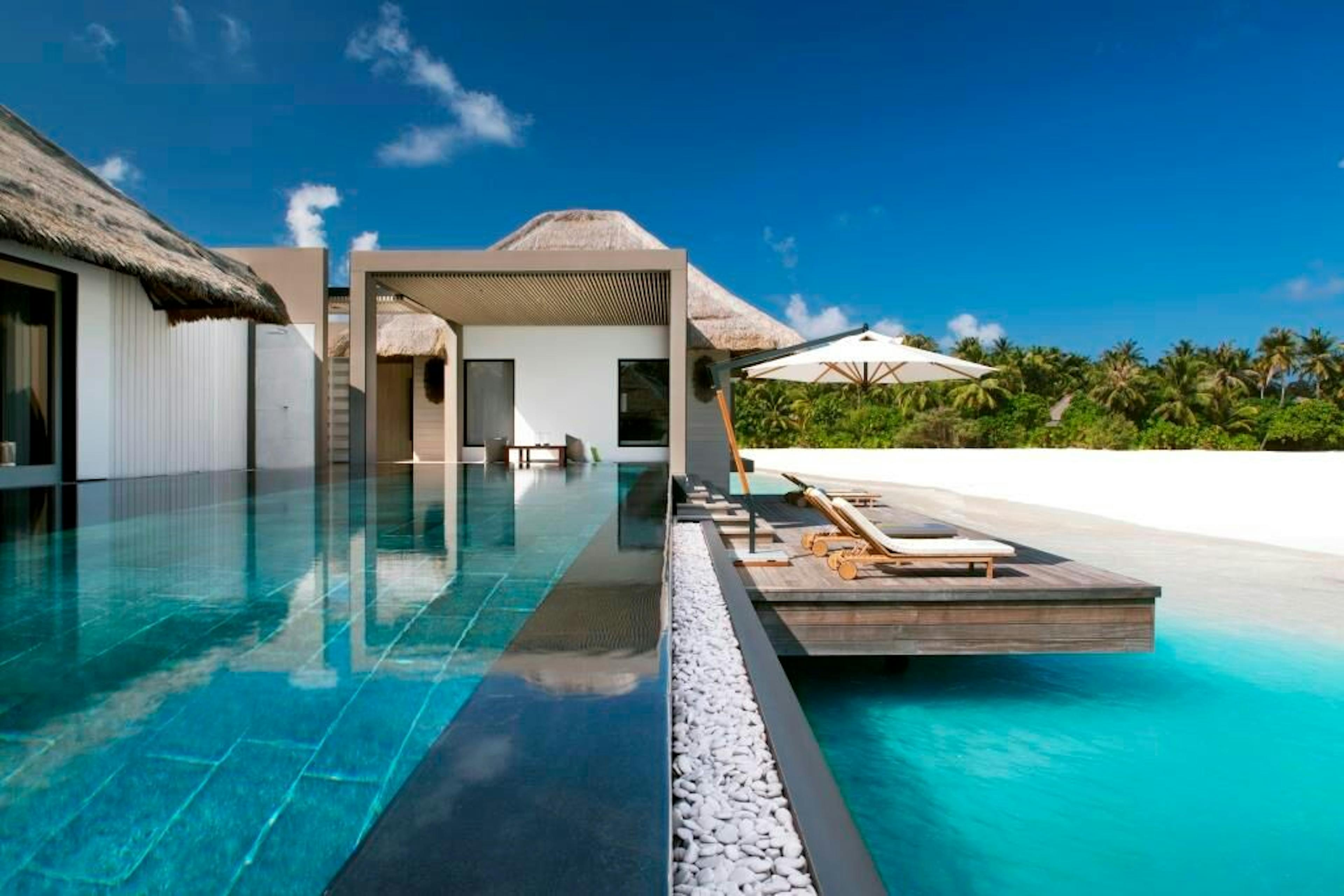 • Terrasses sur pilotis avec table, espaces de détente, piscine à débordement de 12,5 mètres de long, douche extérieure