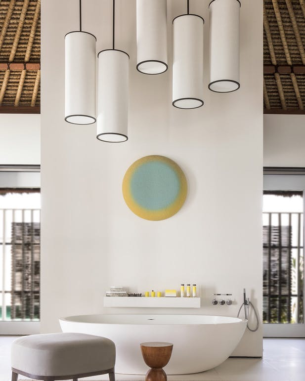 Une partie perchée sur pilotis et l’autre ouvrant sur un jardin exotique, la Garden Water Villa a un parfum d’inédit aux Maldives. A l’intérieur se succèdent un salon spectaculaire, une chambre à coucher adossée à un double dressing et une salle de bain avec baignoire, douches intérieure et extérieure, et toilettes séparées.