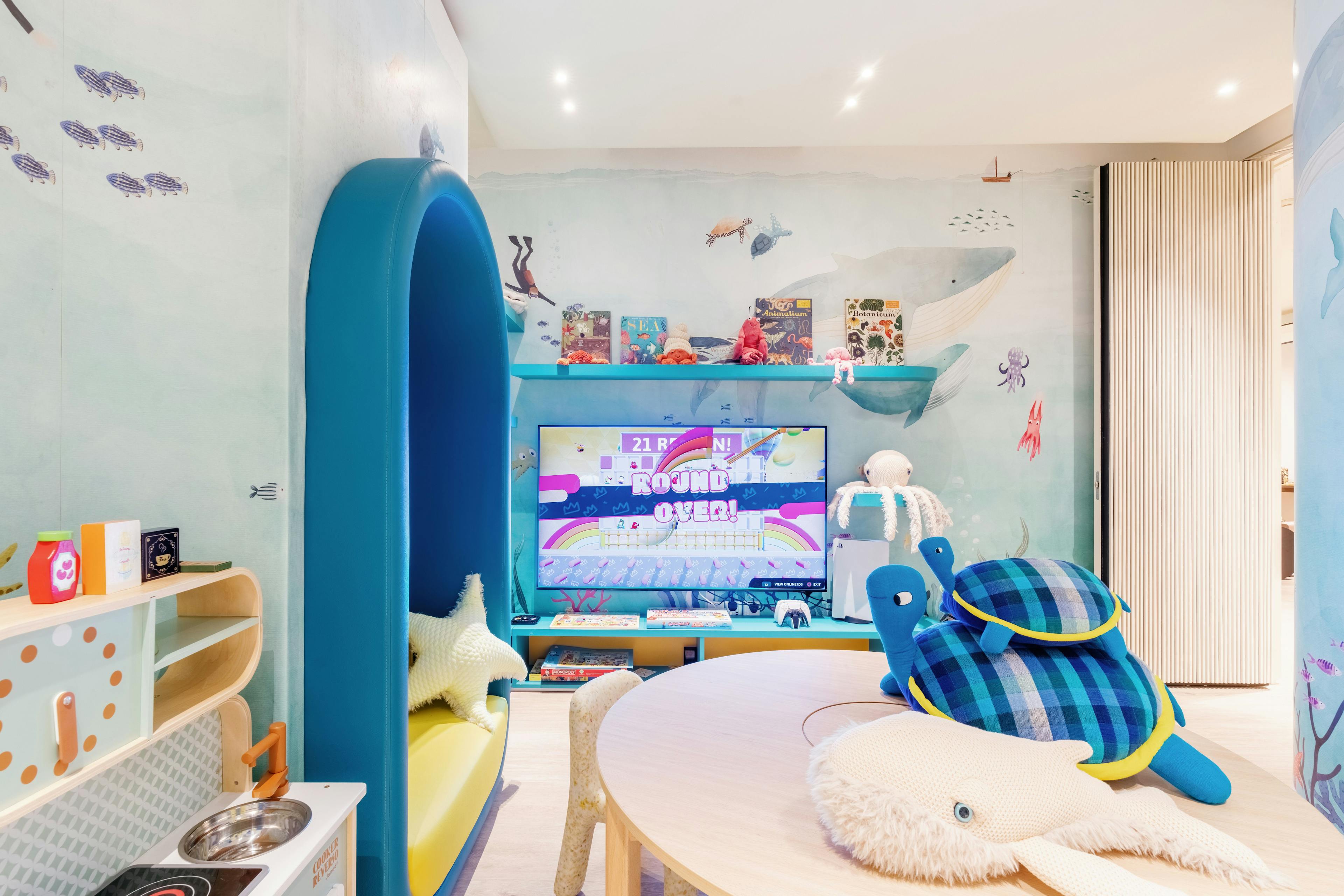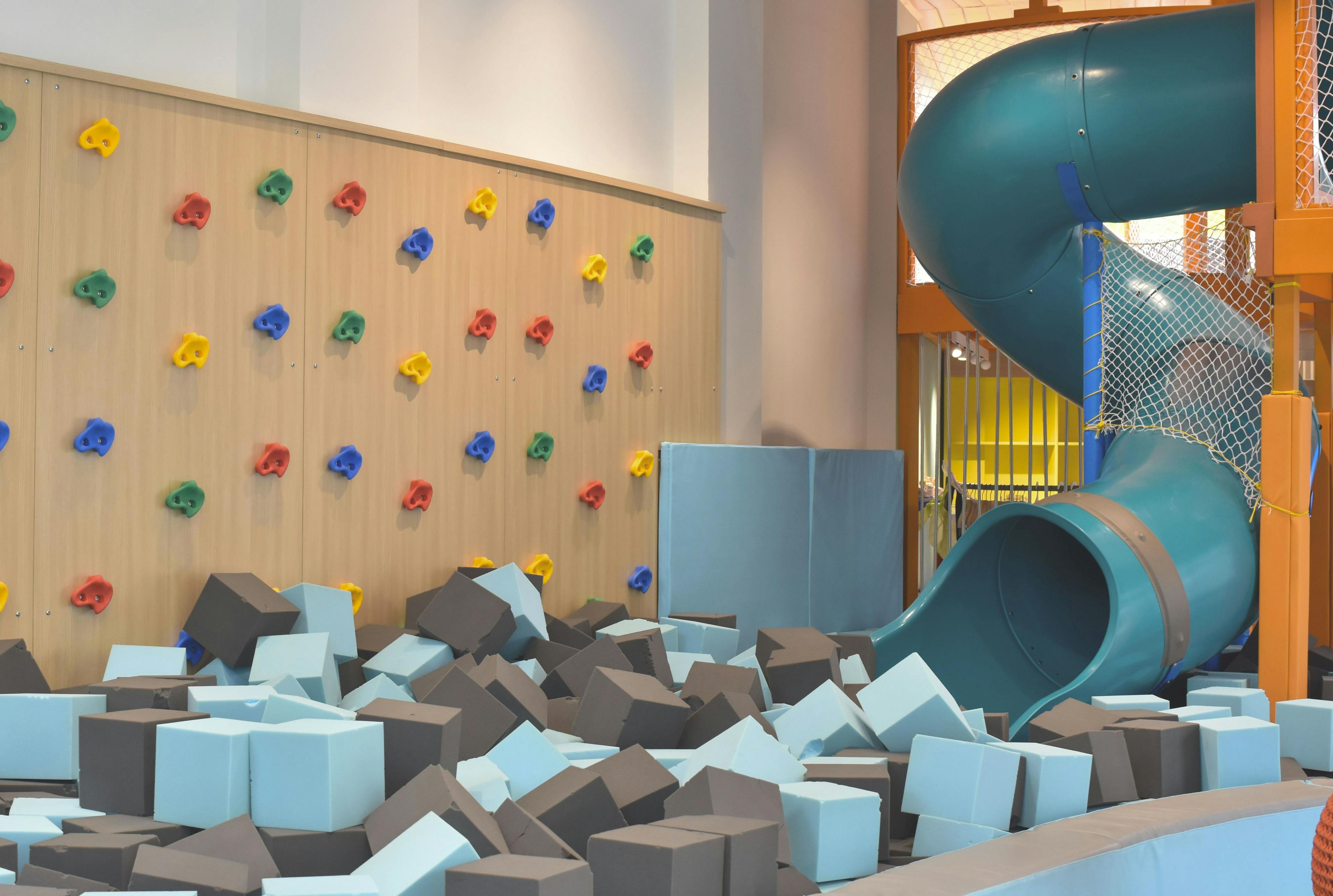 Les murs peints de poissons imaginaires rythment une salle de jeux ouverte sur un trampoline extérieur et révèlent un immense filet arbre, un toboggan ainsi qu’un mur d’escalade. Au mur, la projection d’un écran interactif permet de créer son propre poisson virtuel, qui évolue dans les coraux et autres lagons de l’atoll...