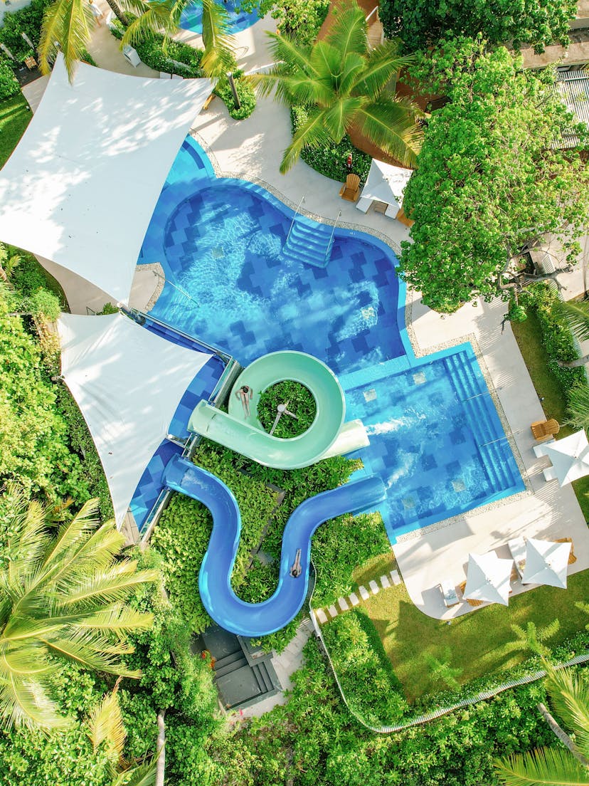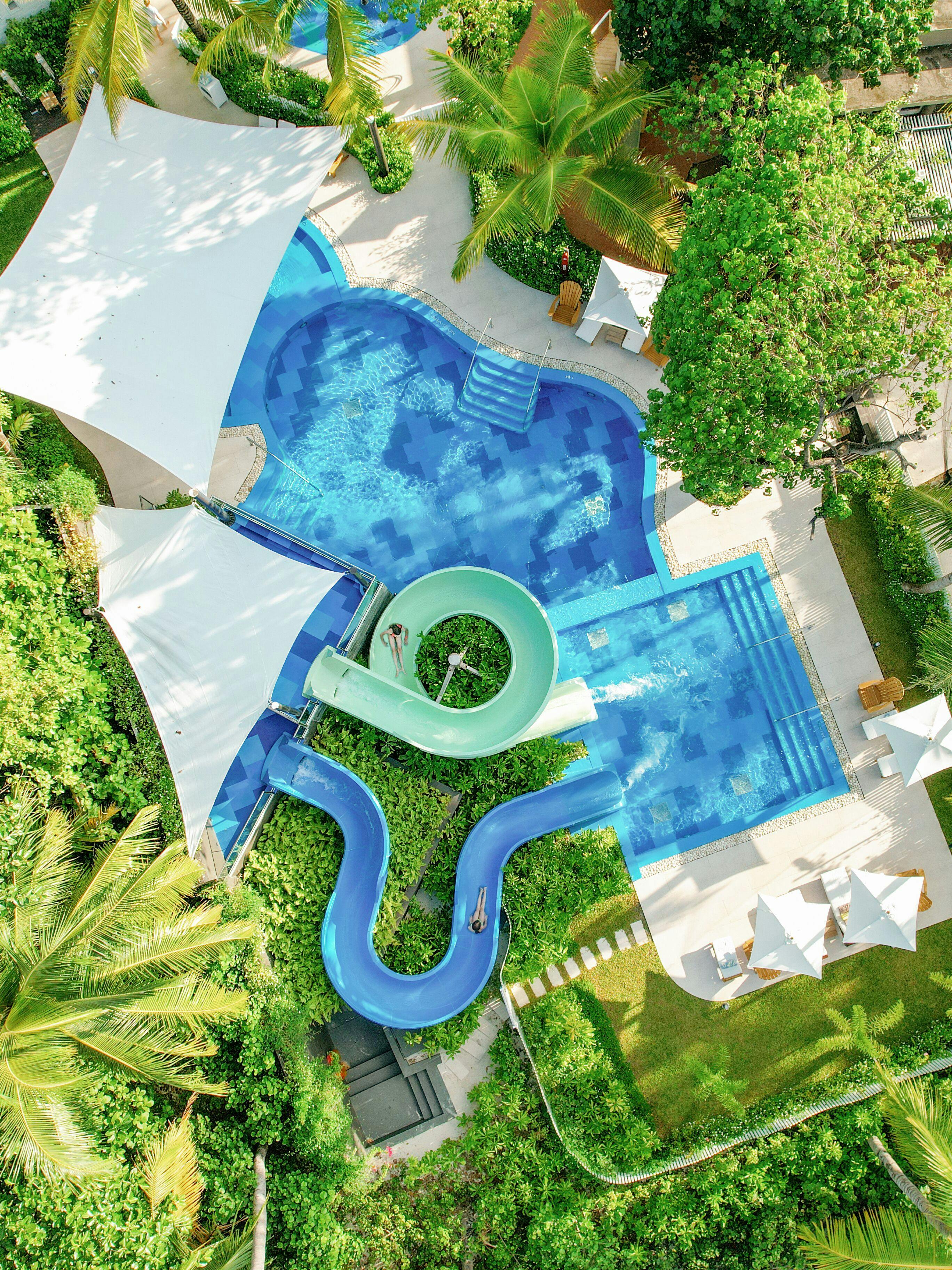 A l'ombre des palmiers, une piscine invite à d'amusantes aventures aquatiques avec son toboggan et ses bouées de toutes les couleurs.