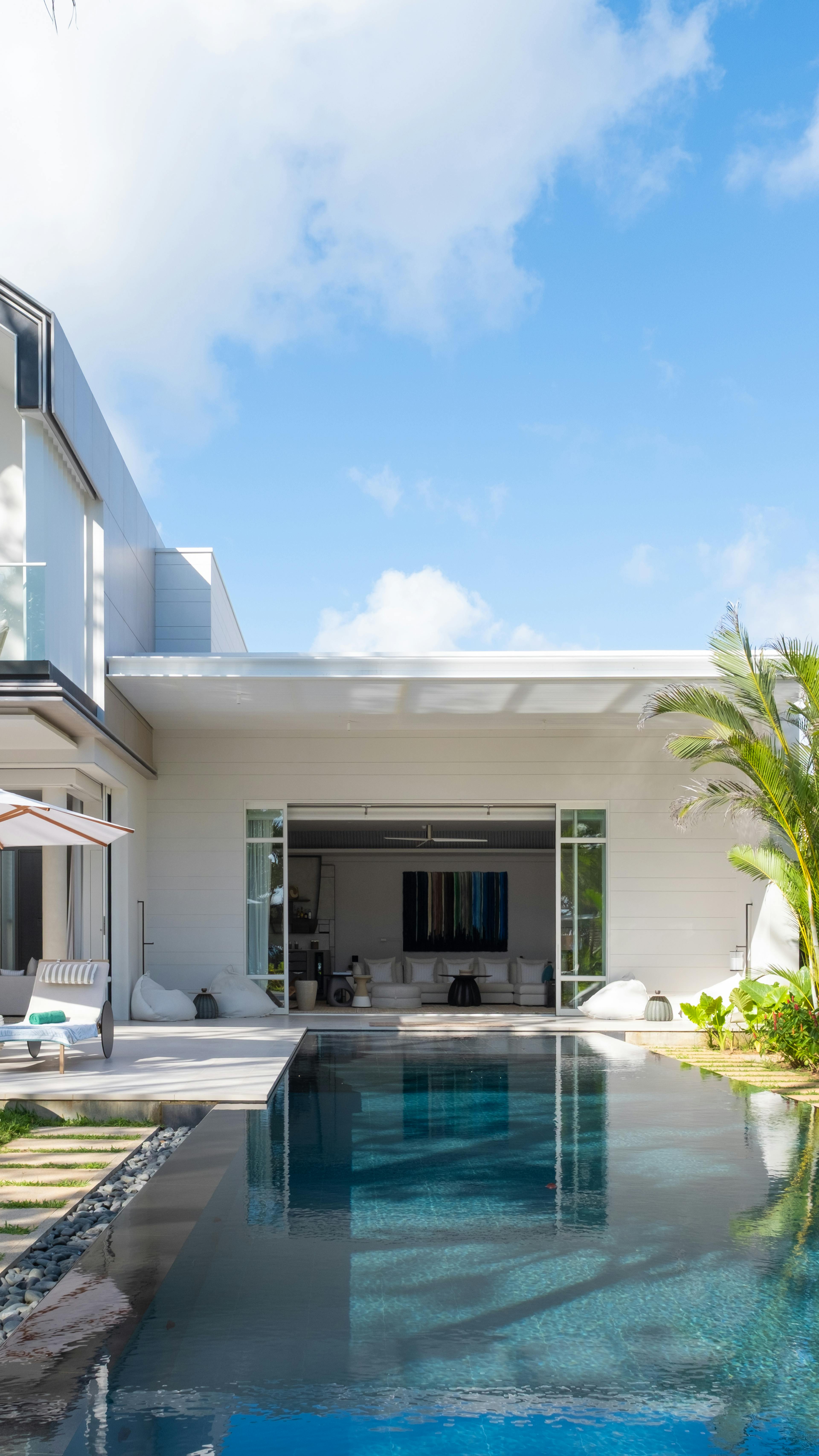 À l'extérieur, bercée par la tranquillité du jardin, la piscine de 18 mètres de long invite à s’abandonner à la douceur de vivre insulaire, tandis que le salon d’été et le pavillon côté plage promettent de mémorables soirées sous le ciel étoilé.