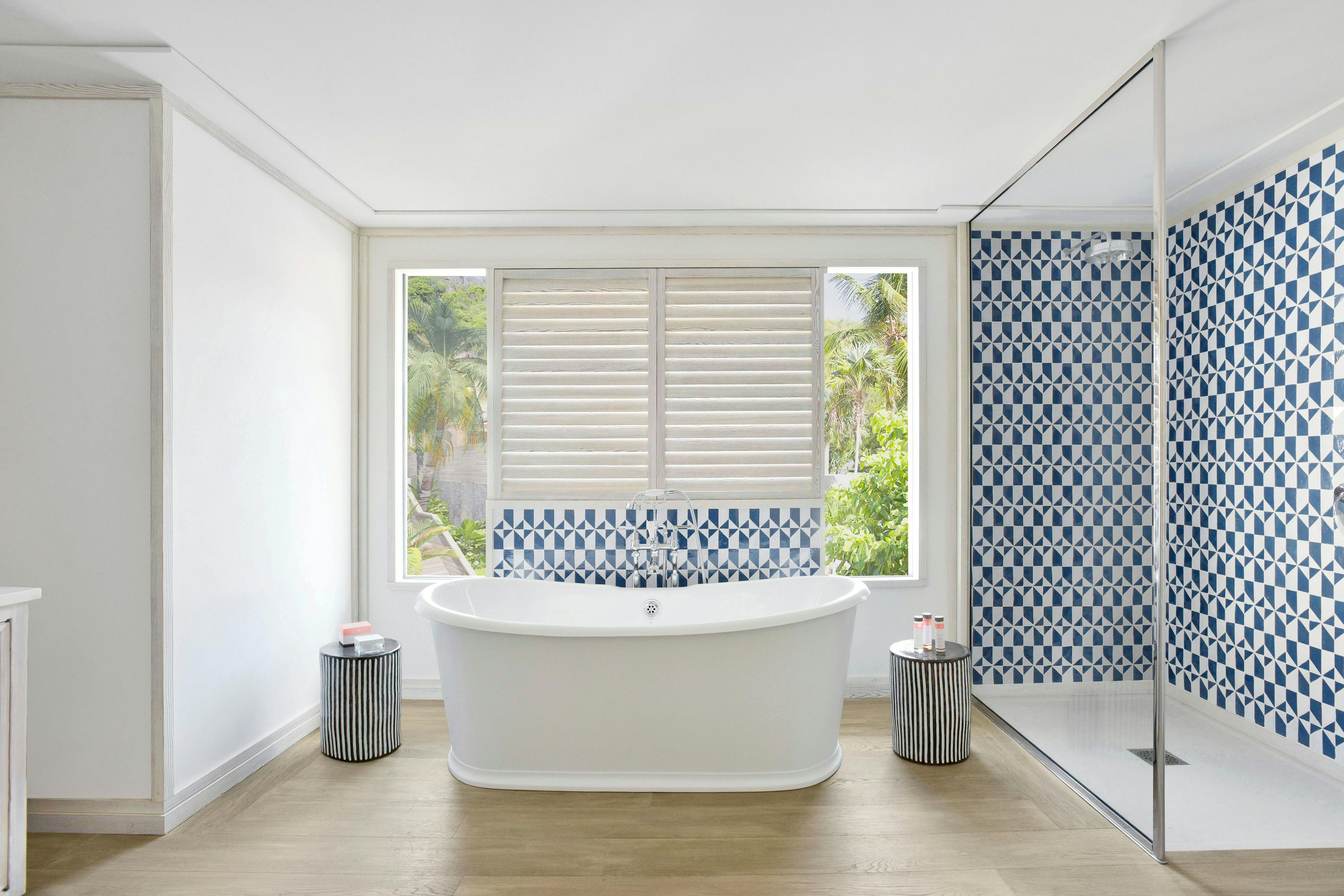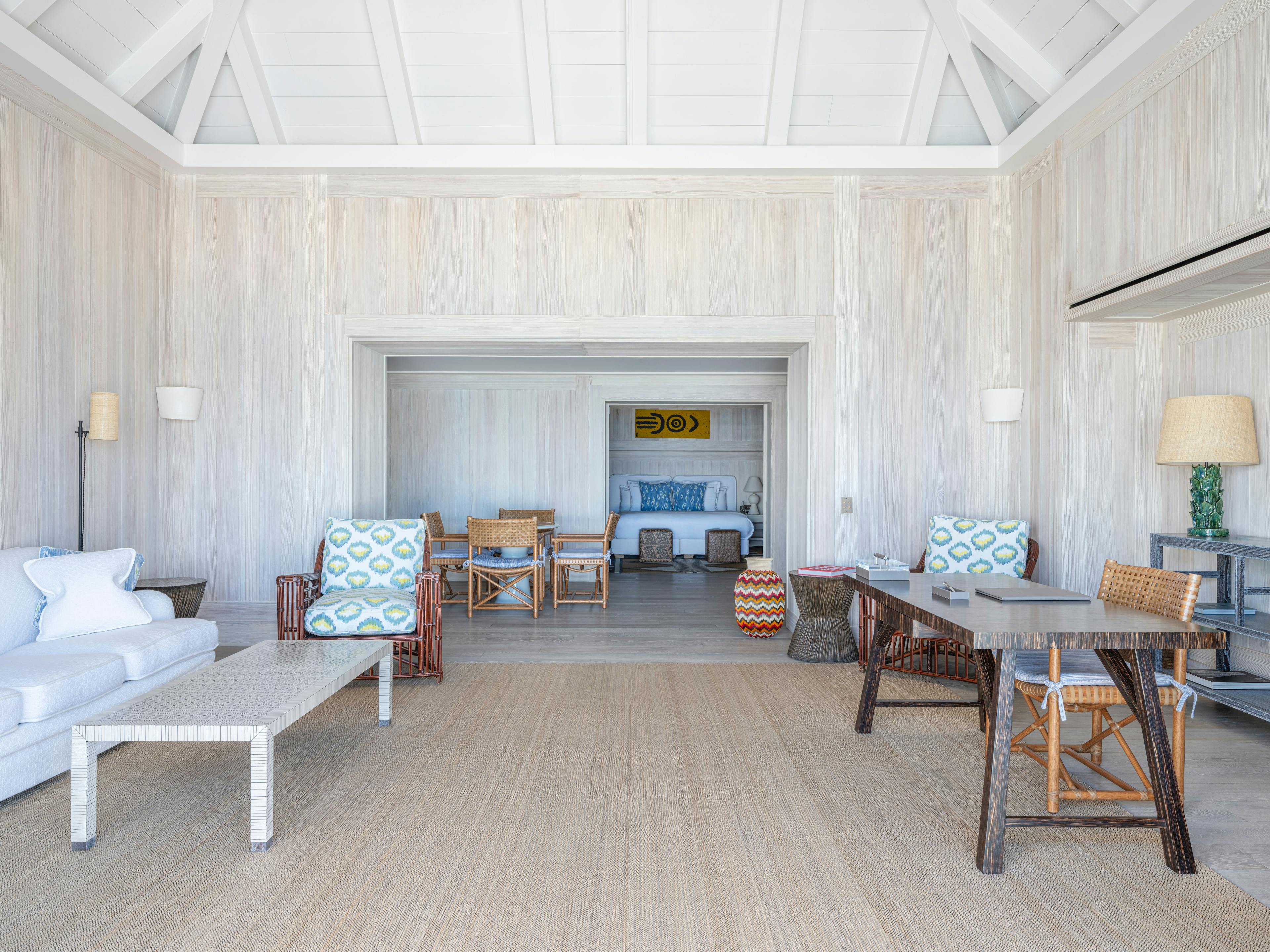 Cette suite accueille une chambre avec son dressing séparé, une salle de bain attenante avec baignoire et douche, un salon, une terrasse et une piscine à débordement surplombant la plage.