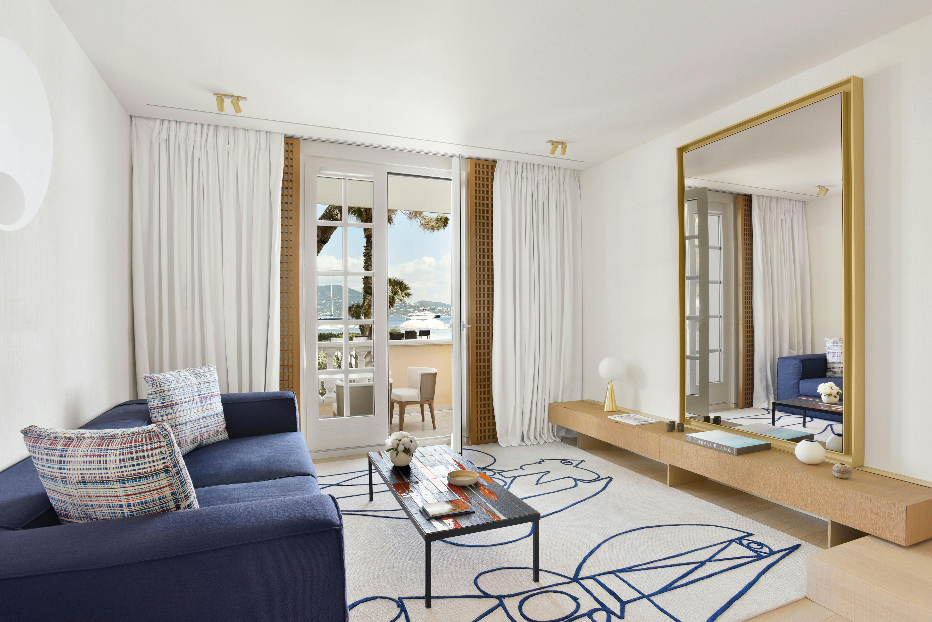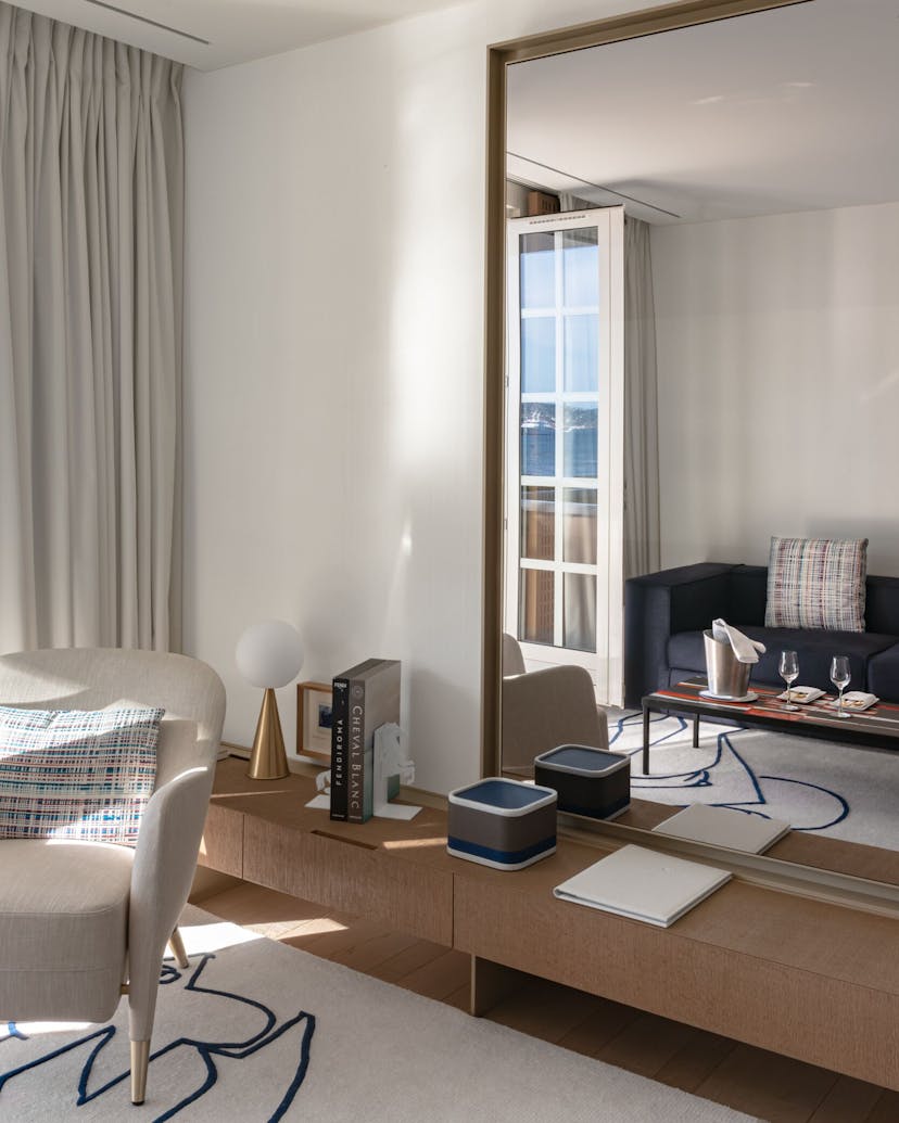 Imaginée par Jean-Michel Wilmotte, la Suite Duplex Mer de 55 m² se déploie avec élégance sur deux étages dans une palette enveloppante de bleu et de crème.