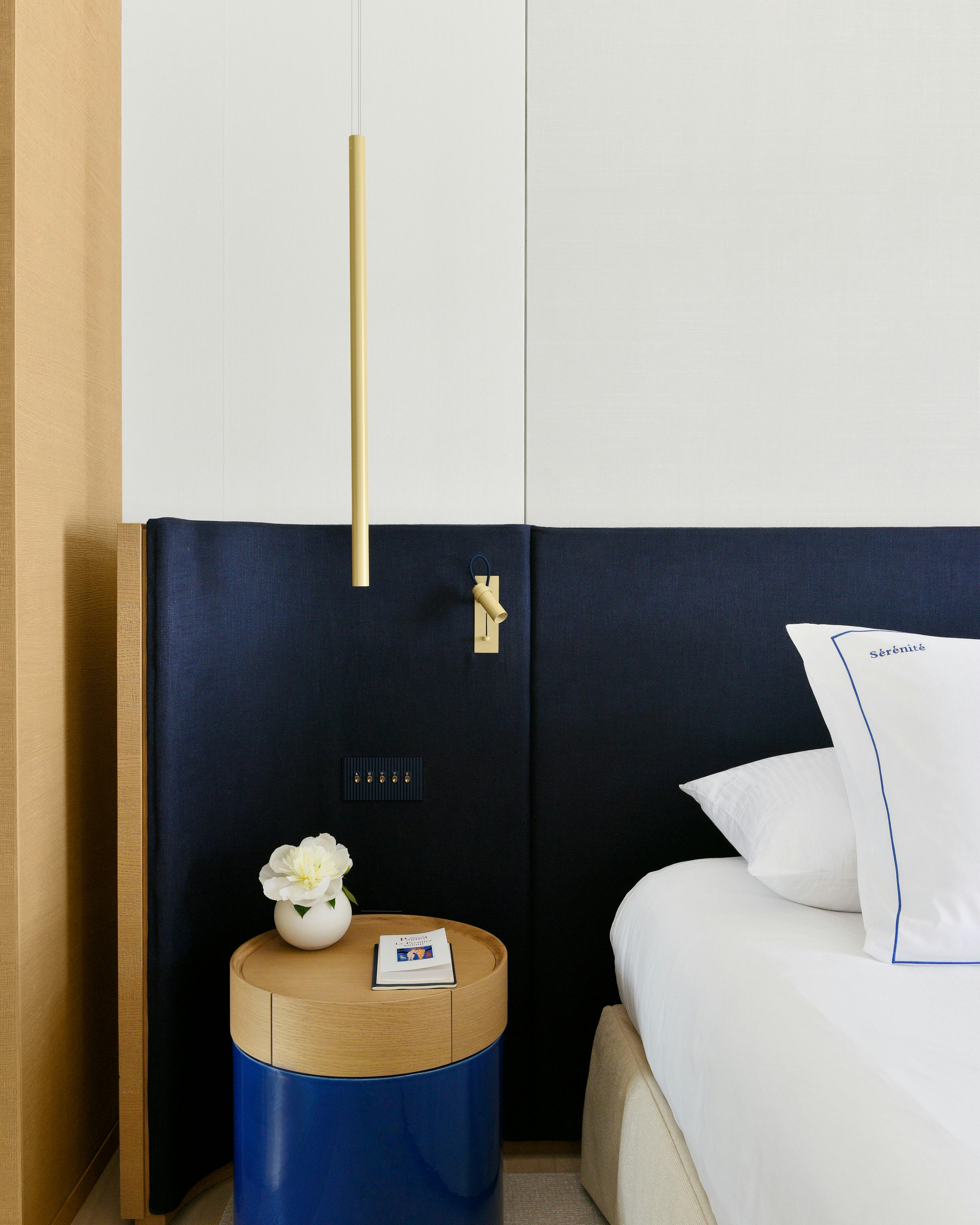 Imaginée par Jean-Michel Wilmotte, la Suite Duplex Mer de 55 m² se déploie avec élégance sur deux étages dans une palette enveloppante de bleu et de crème.
