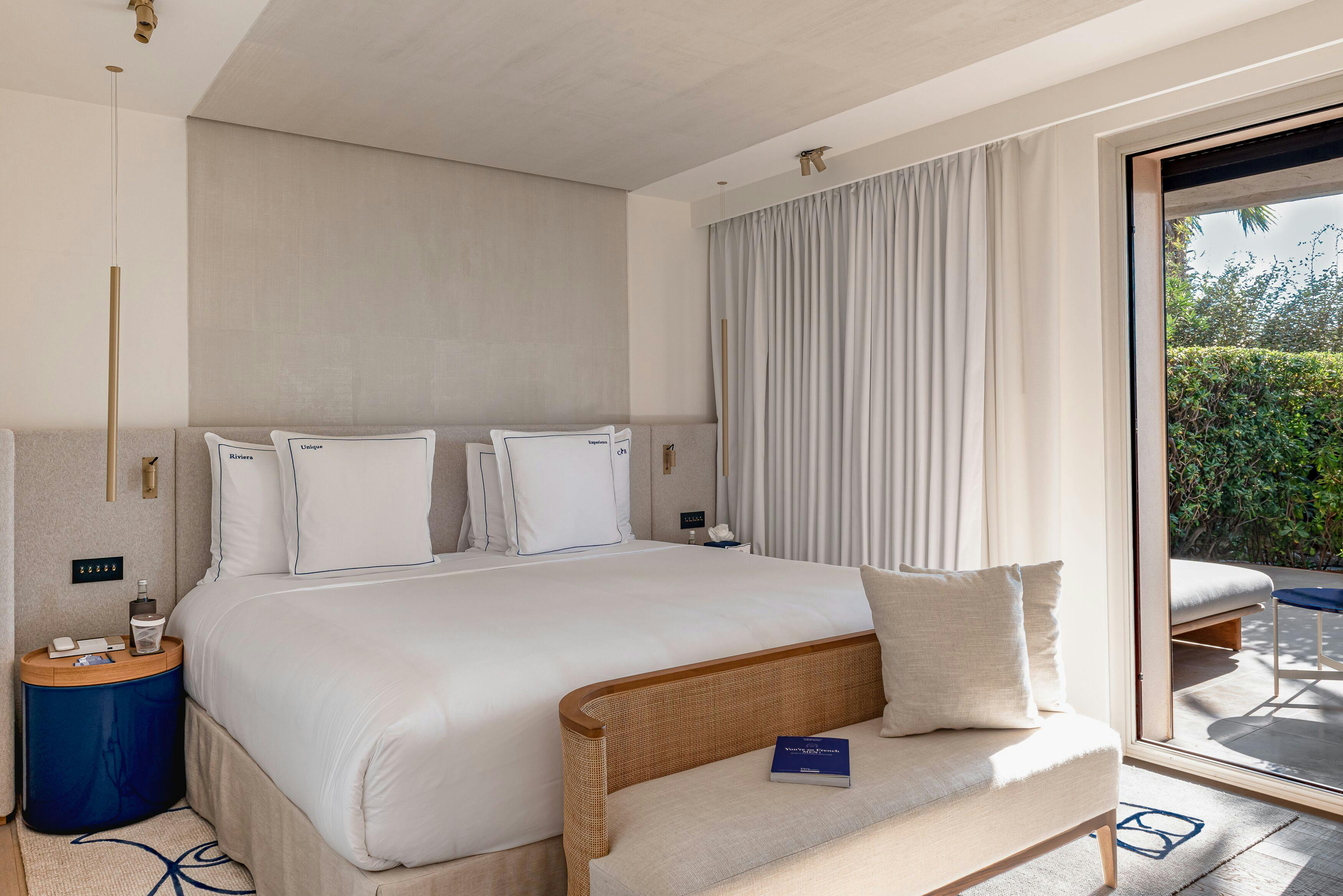Située au rez-de chaussée face à la plage de la Bouillabaisse, la Suite Rez-de-Chaussée s’étend sur 55 m² dans un camaïeu de bleu et de crème mis en scène par Jean-Michel Wilmotte. Elle se compose d'une chambre spacieuse avec une élégante coiffeuse, d’un salon indépendant, d’un dressing séparé et d’une salle de bain avec baignoire et douche à l’italienne.