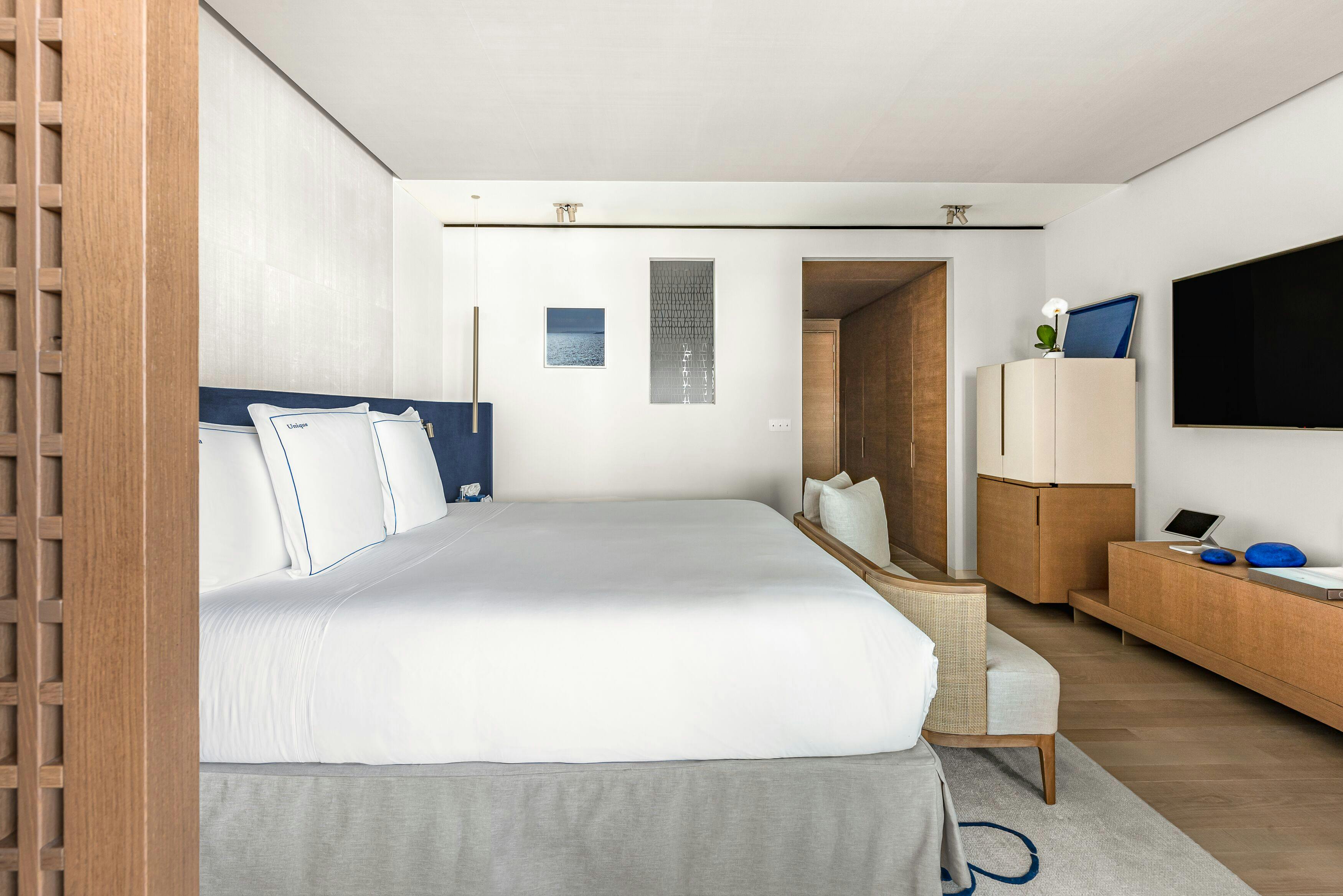 Face à la plage de la Maison, donnant sur la mer Méditerranée, la Chambre Supérieure Mer Rez-de-Chaussée de 25 m², dévoile une atmosphère contemporaine, rythmée par le bleu de la Méditerranée et l’esprit de la Riviera mis en scène par Jean-Michel Wilmotte. Elle offre également une salle de bain avec douche à l’italienne.