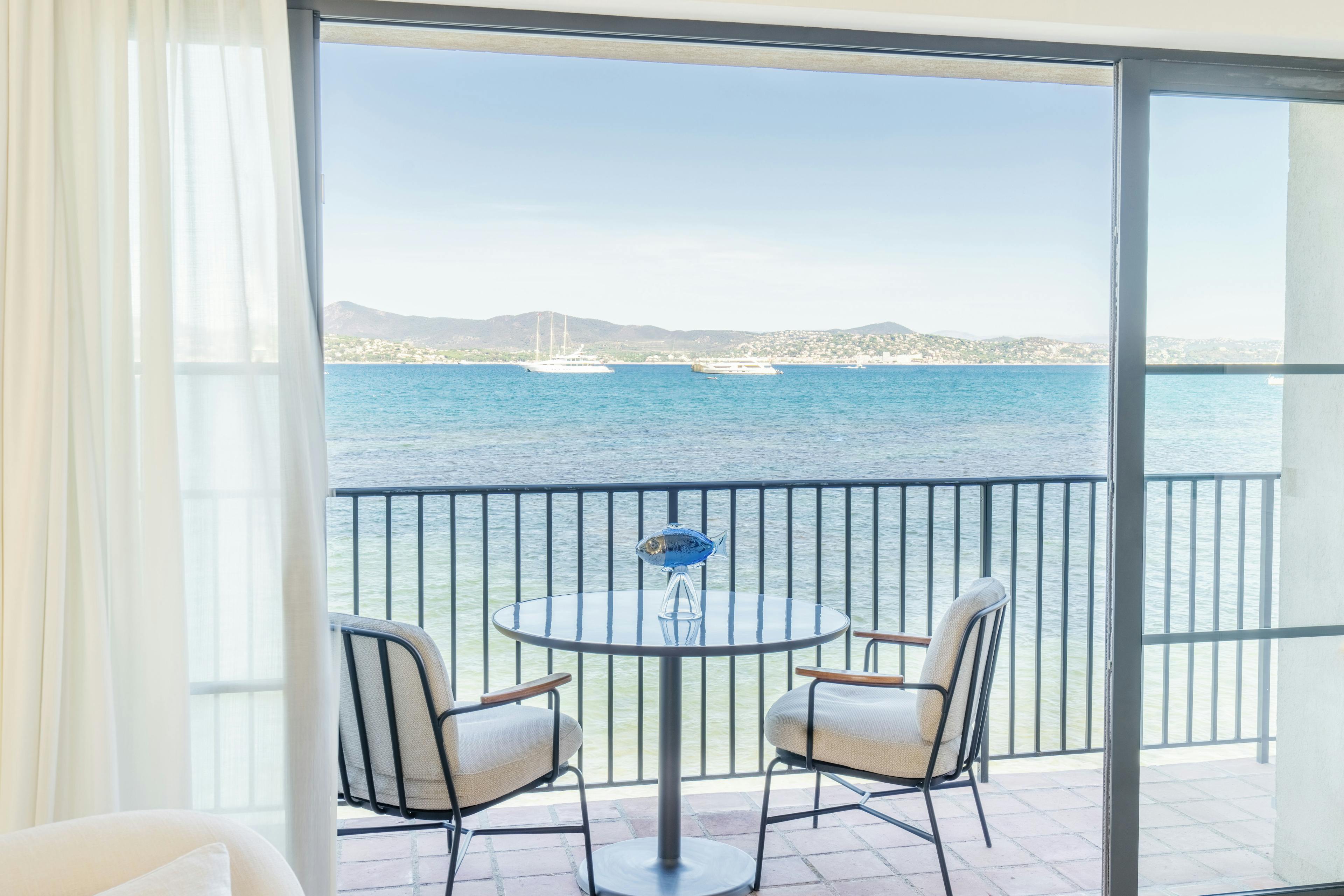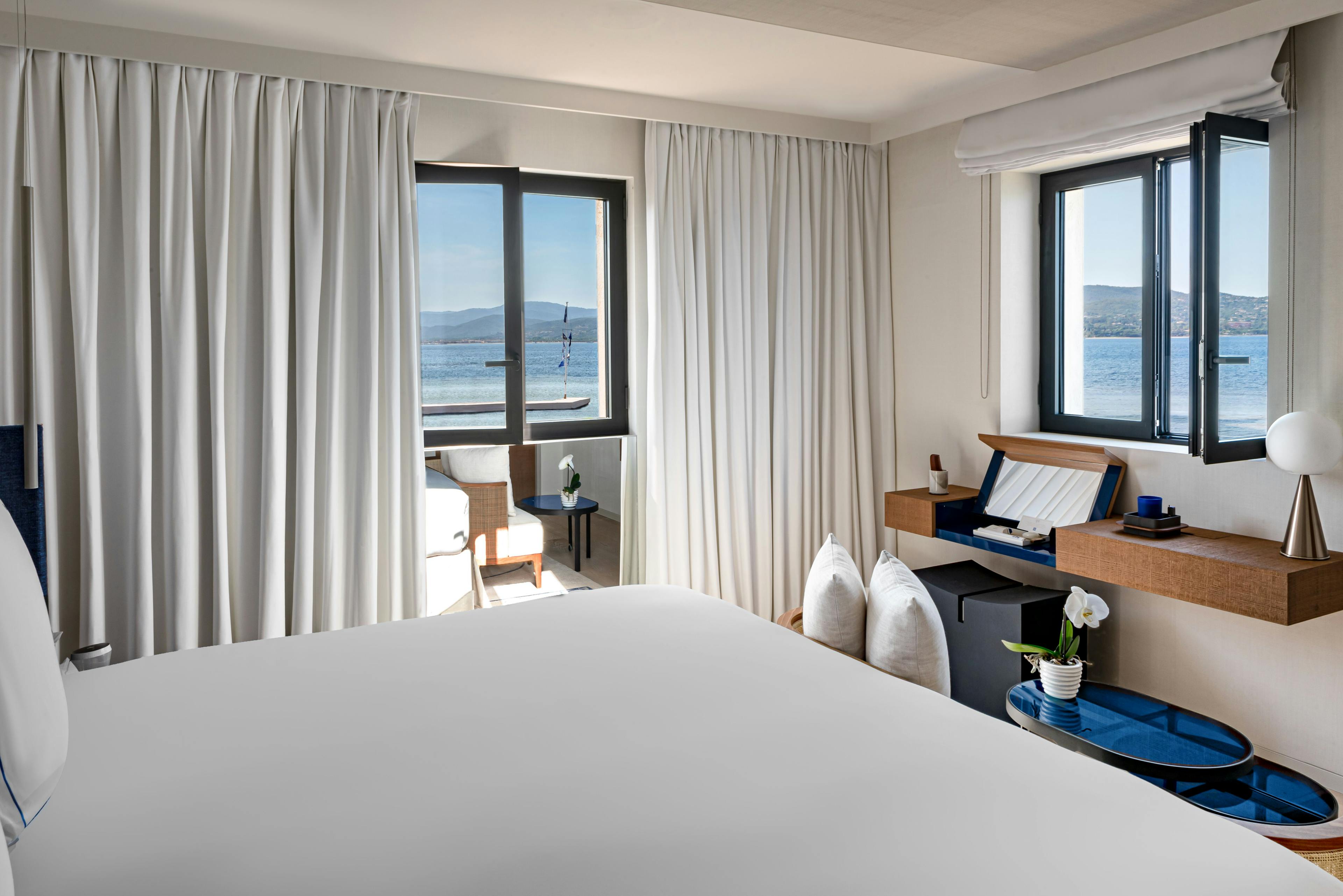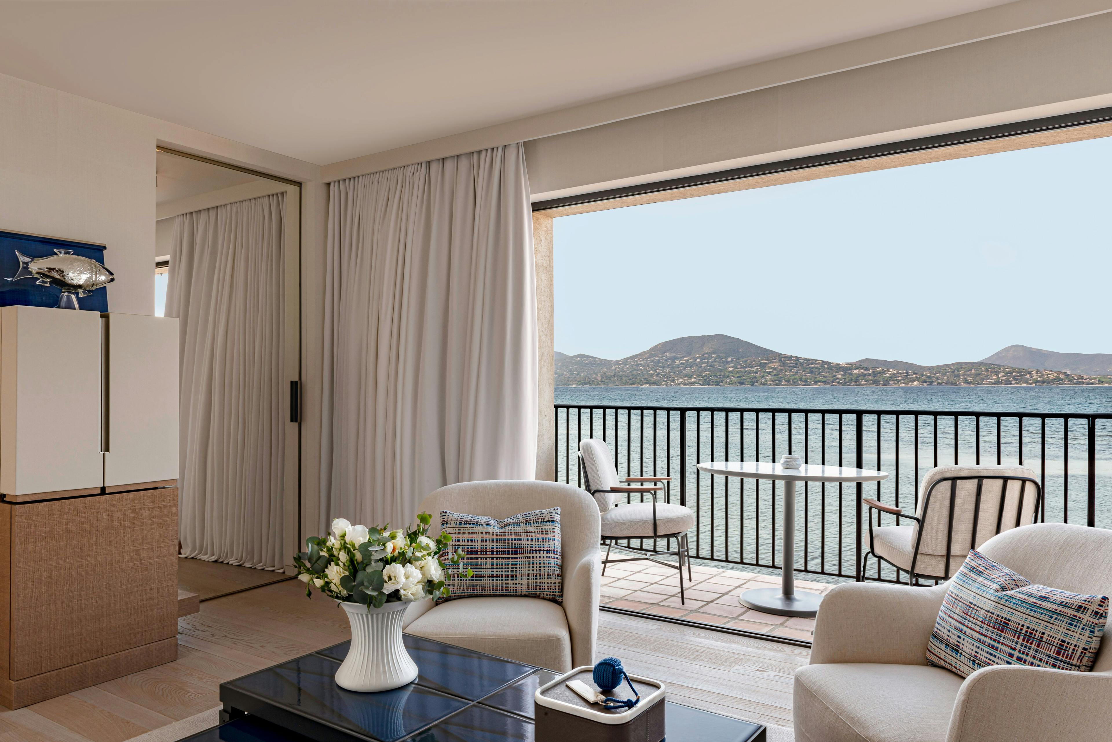 Perchée au premier étage d’une charmante maison au sein de la propriété, à quelques pas de l’hôtel et bordée par la Méditerranée, la Suite Heure Bleue de 70 m² dévoile de sublimes vues sur le golfe de Saint-Tropez.