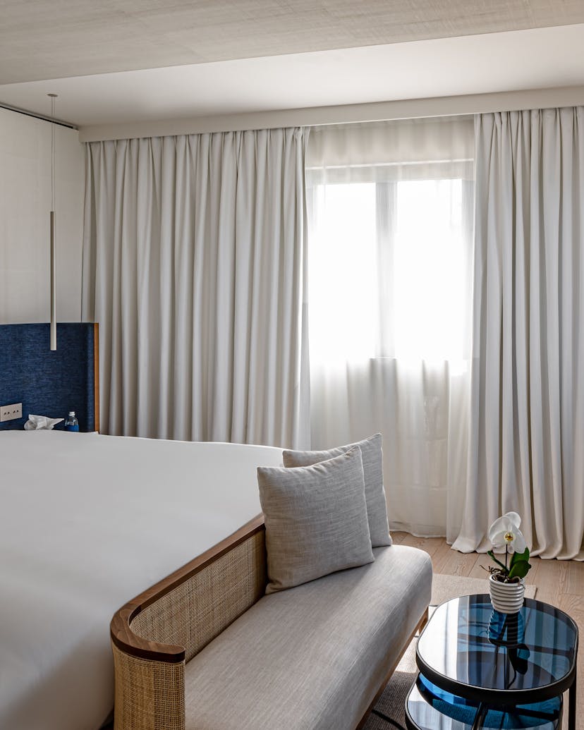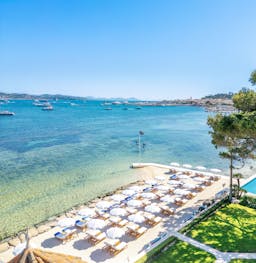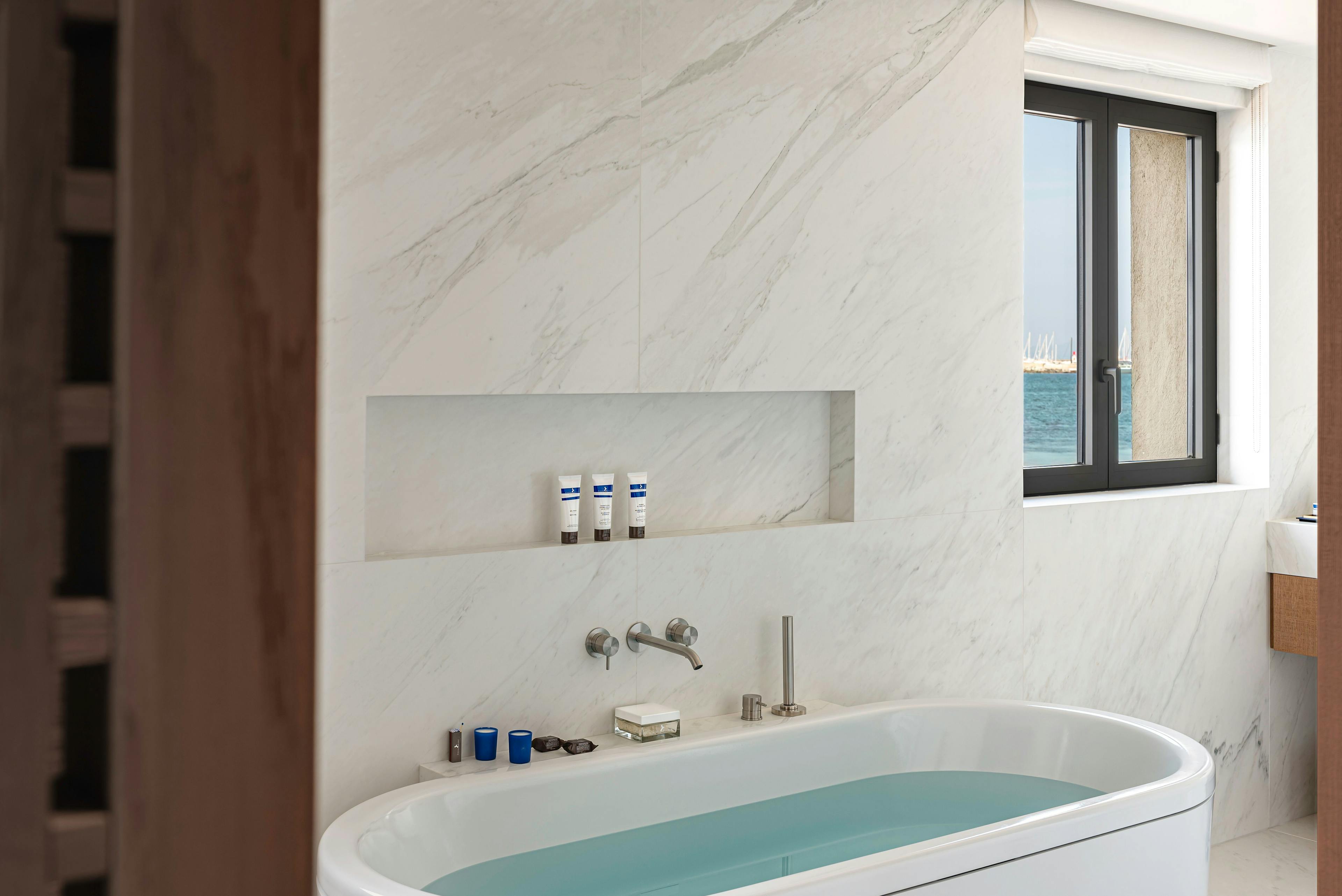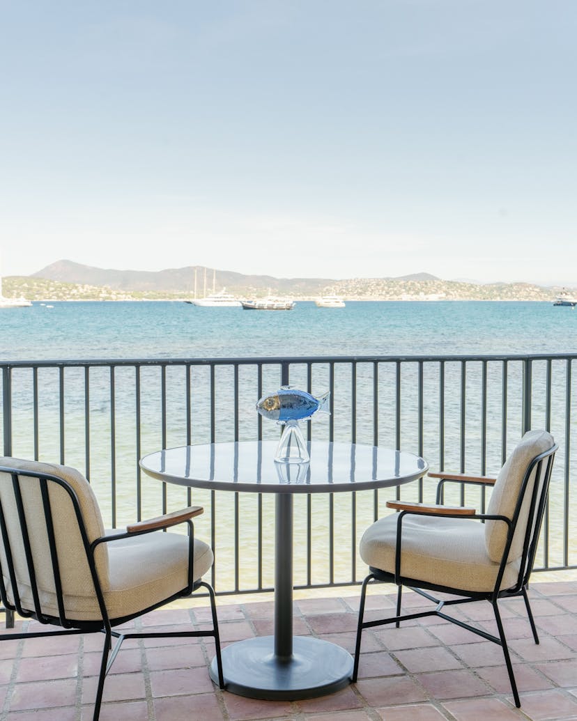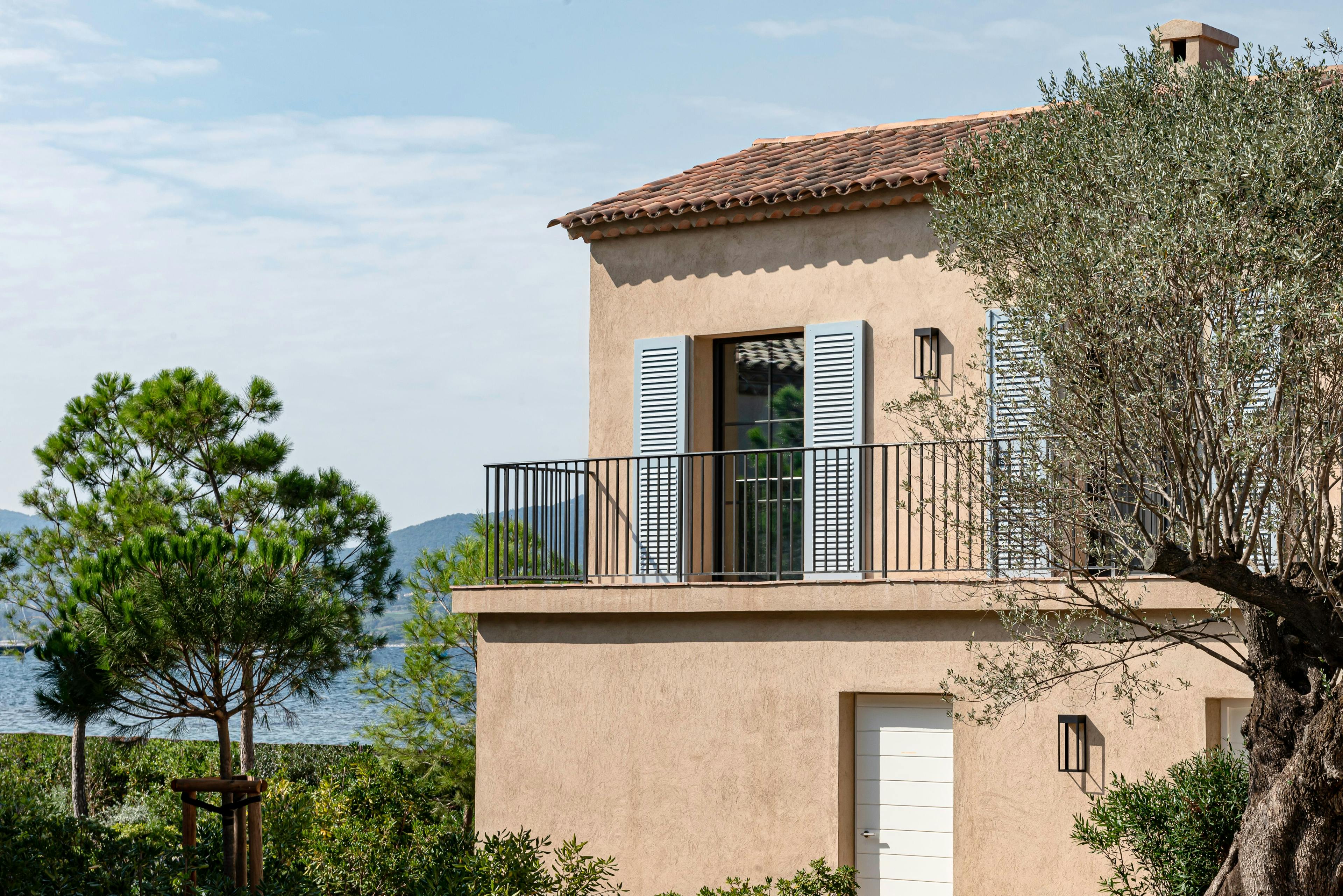 Perchée au premier étage d’une charmante maison au sein de la propriété, à quelques pas de l’hôtel et bordée par la Méditerranée, la Suite Heure Bleue de 70 m² dévoile de sublimes vues sur le golfe de Saint-Tropez.