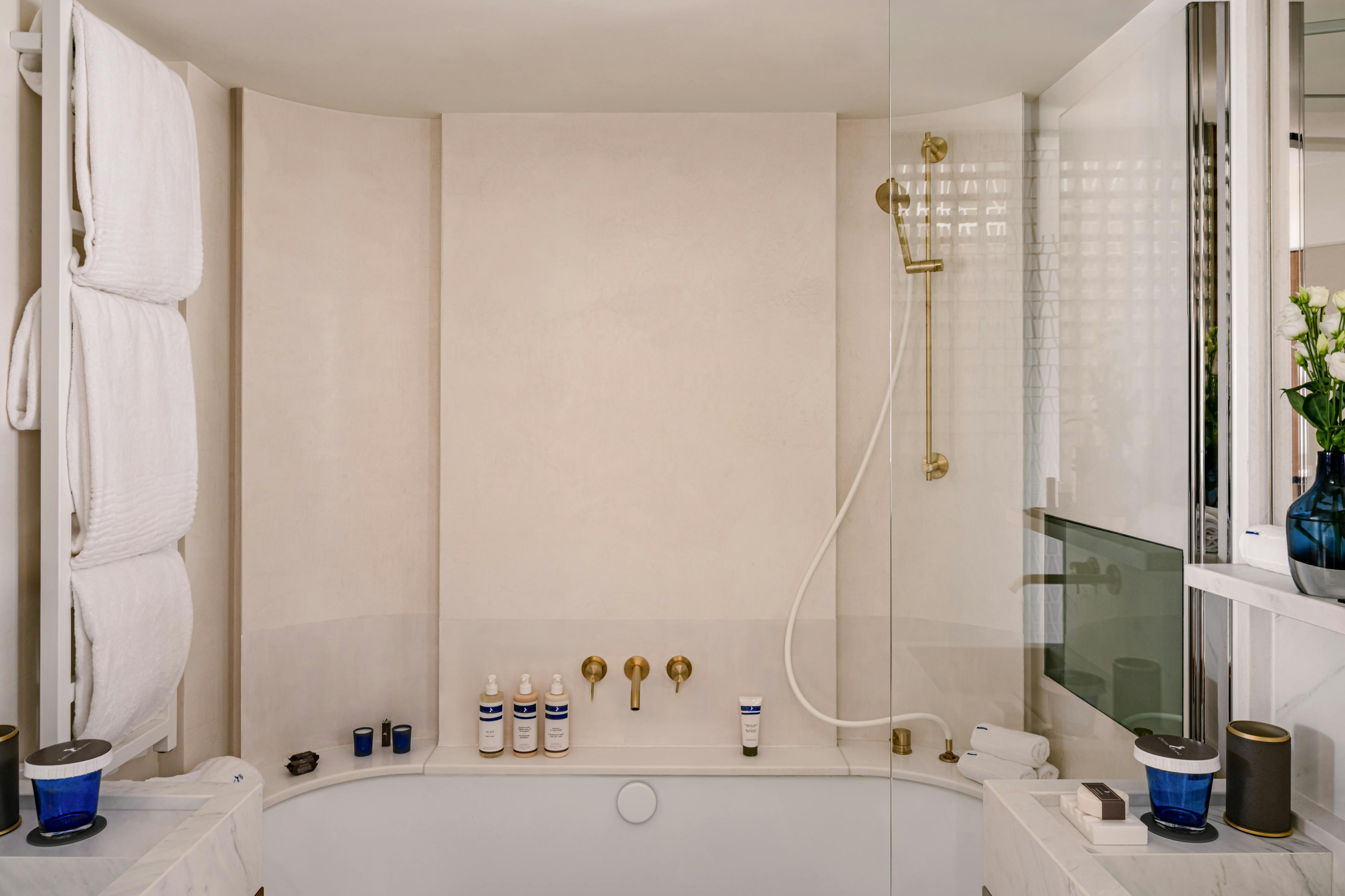 Nichée au premier étage, la Chambre Atelier Mer invite à une escapade bohème en Provence. Tonalités terracotta et crème se mêlent dans un colorama imaginé par Jean-Michel Wilmotte en hommage à l’esprit Riviera.
